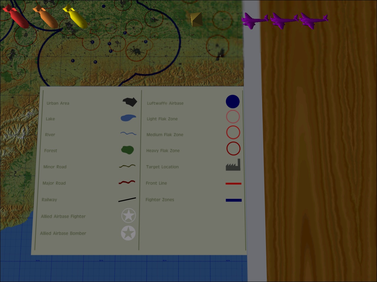 Была в далёкие 90-е такая игра: "B-17 Flaing fortress. The mighty eight" Попалась в руки на днях. Симулятор. Графика в ней, конечно, по нынешним временам совсем "не айс", многое раздражает, а кое что, например невозможность глядя в лобовое стекло опустить взгляд на приборы(для этого нужно нажать отдельную кнопку, тогда открыается вид на приборную доску, но не видно ничего другого) просто бесит, но... Анимированный экипаж(они двигаются, штурман "голосом через рот" сообщает нужный курс и т.п.), масса подсистем, всякие насосы, генераторы, тормозов одних штук пять разных. а главное, там можно было летать на такой карте(см. рисунки). Вот бы в "Ил" её. Хотя, такую карту, с графикой "Ила" пожалуй ни один комп не потянет...