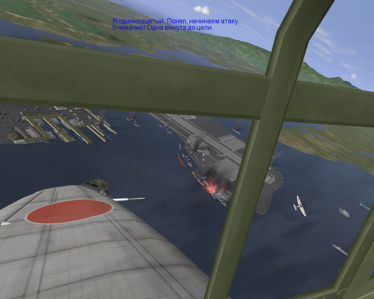 Миссия "Налёт на Перл-Харбор. Вторая волна" на D3A1. Обстановка в гавани воссоздана на основе фотографий. К сожалению, ввиду накладываемых игрой ограничений там нельзя размещать движущиеся корабли, поэтому линкор, изображающий "Неваду" остаётся неподвижным на фарватере.