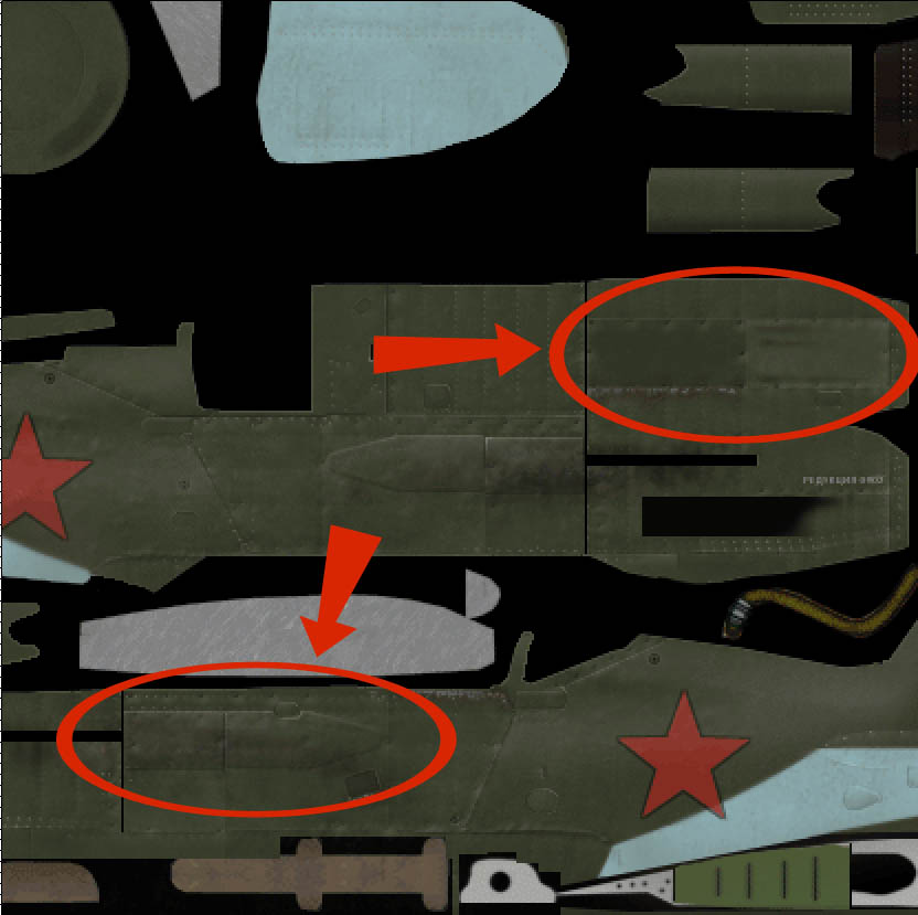 Также хочу отметить что таким макаром рисуются полотняные поверхности рулей. Да всего что торчит и не торчит. От "расшивки" тоже стоит отказаться. Размеры шкурки таковы, что линия в 1 пиксель слишком велика. Поэтому линию стыковки панелей я предпочитаю рисовать так: создаю слой СЕРЫЙ (оверлей) и выделяю "панель" - пускай прямоугольный участок (пускай 50 на 50 пикселей) теперь мягко инструментом "высветление" засвечиваю край панели. Кисть мягкая, размером 10-20 пикселей. Очень мягко! Потом инвертирую выделение и соседнюю "панель" чуток темню. По итогу у нас состыковываются две поверхности : одна чуток светлее, другая темнее... Еще можно зоны стыка "подшарпить", что бы граница стала четче, но тут все дело в чувстве меры. Поскольку это отдельный слой, интенсивность можно менять произвольно. В результате толщина стыка стремится к нулю, а мы еще получаем "закос под карту нормалей". Для примитивной системы освещения в Ил-2 это выглядит хорошо (как по мне). Тут без иллюстраций. Для примера - так нарисованы мои шкурки для МиГов.