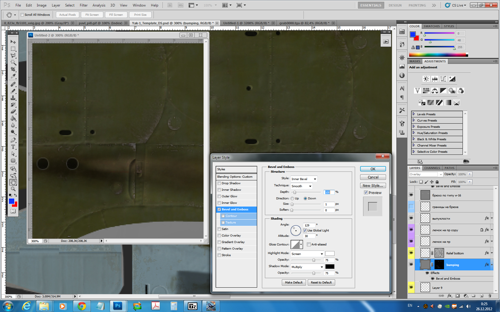 Самая главная хитрость. У этого слоя bumping есть СЛОЙ-ЭФФЕКТ (его х-ки видны на скриншоте предыдущего поста). И самое главное: у него есть СЛОЙ-маска. Сначала я слой маску просто заливаю черным, а потом рисую на нем белым. Просто для начала создай такой слой, залей слой маску, присвой слой-эффект и черкани белым карандашиком (размер кисти 1-2 пикселя по МАСКЕ. Вуаля: какая-то неровность. Теперь можно этот штришок на маске размазывать инструментом "палец", или размывать блюром или... Короче - играться.. Можно менять слой-эффект: вместо inner bevel - emboss или pillow emboss или источник света сместить - все на панели слой-эффекта меняется. Но лучше не рисовать руками, а слазить на сайт cgtextures.com и там нарыть подходящую текстурку и отредактировав один из цветовых каналов использовать готовую визуальную информацию: это создаст особо реалистичное впечатление. ) Вотпримерна: