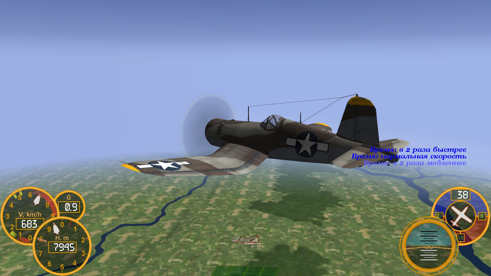 [Pratt-Whitney-R-2800-18W/DFL/F4U-4] Type Radial Direction Right Autonomous 1 Cylinders 18 Carburetor 1 TowFactor 1.0 EngineAcceleration 5.5 HorsePowers 2120.0 BoostFactor 1.0 WEPBoostFactor 1.1556605 cAfterburner 0 AfterburnerType 4 MixerType 1 cMix 1 MixerAltitude 8000 PropMass 292.0 RPMMin 200 RPMNom 2800 RPMMax 2800 RPMMaxAllowed 3200 Reductor 0.99 // 0.45 PropDiameter 3.412 // 4.012 PropAnglerType 2 PropAnglerSpeed 0.18 PropAnglerMinParam 1260.0 PropAnglerMaxParam 2800.0 PropAnglerAfterburnerParam 2830.0 PropPhiMin 8.0 PropPhiMax 54.0 PropAoA0 11.0 Voptimal 360.0 cCompressor 1 CompressorType 1 CompressorSteps 3 CompressorPAt0 0.40 CompressorRPMCurvature 1.5 CompressorPMax 2.066 CompressorAltitude0 2286.0 CompressorMultiplier0 0.8585 CompressorBaseMultiplier0 0.8585 CompressorAltitude1 5640.0 CompressorMultiplier1 0.9334 CompressorBaseMultiplier1 0.9334 CompressorAltitude2 7620.0 CompressorMultiplier2 0.849 CompressorBaseMultiplier2 0.849 CompressorRPMP0 2000.0 CompressorRPMPMax 2830.0 CompressorMaxATARPM 1.877 CompressorSpeedManifold 0.80 CompressorRPM0 600 CompressorATA0 0.40 CompressorRPM1 1000 CompressorATA1 0.60 CompressorRPM2 1200 CompressorATA2 0.65 CompressorRPM3 1800 CompressorATA3 0.85 CompressorRPM4 2000 CompressorATA4 1.00 CompressorRPM5 2150 CompressorATA5 1.08468 CompressorRPM6 2600 CompressorATA6 1.4979 CompressorRPM7 2800 CompressorATA7 1.877 // CompressorRPM8 2830 // CompressorATA8 2.066 DisP0x 2800 DisP0y 0 DisP1x 0 DisP1y 80 TESPEED 0.01 TWATERMAXRPM 205 TOILINMAXRPM 60 TOILOUTMAXRPM 75 MAXRPMTIME 300 MINRPMTIME 999 TWATERMAX 262 TWATERMIN 170 TOILMAX 100 TOILMIN 40 Скорость у земли 527 км. в час на 100 проц. тяги, радиатор-8. Скорость на высоте на второй третьей ступени на картинках, радиатор 8, перегрева нет. Тест проводил на карте Смоленск. Проявился иловский баг непереваривания большого веса винта. На малом шаге и сбросе тяги ероплан резко опускает нос и уходит в пике, рули высоты не помогают. На посадке нельзя опускать шаг ниже 50 и тягу ниже 30 проц. Нужно пользоваться триммерами - на посадке выкручивать триммер руля высоты на 20-25 делений. Глиссаду желательно построить далековато от полосы, постепенно снижая скорость выпуском закрылков и шасси. Если правильно построить заход, то за 1.5-2 км. от полосы тяга должна быть 33-37 проц. При касании скорость получится 150 по прибору и пригать Корсар не будет. Последний раз редактировалось Vasya; 19.05.2020 в 20:11. Причина: дописка текста |
