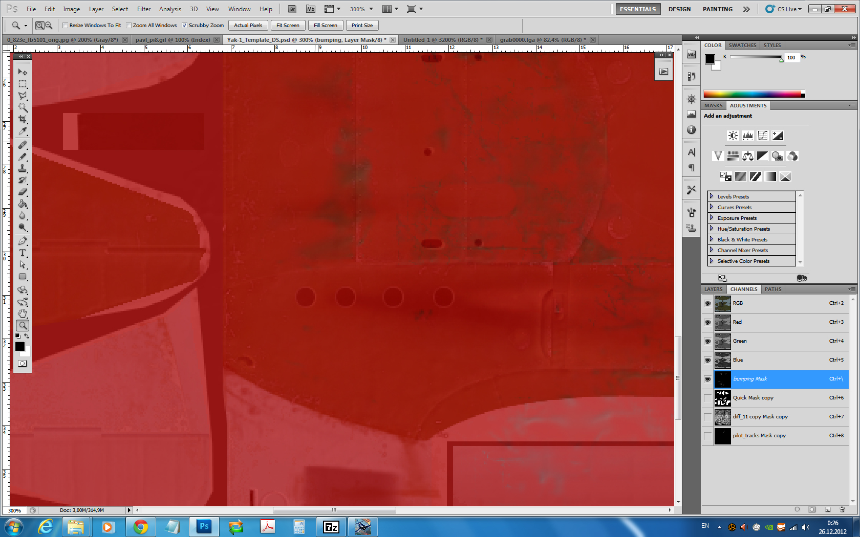 Также хочу отметить что таким макаром рисуются полотняные поверхности рулей. Да всего что торчит и не торчит. От "расшивки" тоже стоит отказаться. Размеры шкурки таковы, что линия в 1 пиксель слишком велика. Поэтому линию стыковки панелей я предпочитаю рисовать так: создаю слой СЕРЫЙ (оверлей) и выделяю "панель" - пускай прямоугольный участок (пускай 50 на 50 пикселей) теперь мягко инструментом "высветление" засвечиваю край панели. Кисть мягкая, размером 10-20 пикселей. Очень мягко! Потом инвертирую выделение и соседнюю "панель" чуток темню. По итогу у нас состыковываются две поверхности : одна чуток светлее, другая темнее... Еще можно зоны стыка "подшарпить", что бы граница стала четче, но тут все дело в чувстве меры. Поскольку это отдельный слой, интенсивность можно менять произвольно. В результате толщина стыка стремится к нулю, а мы еще получаем "закос под карту нормалей". Для примитивной системы освещения в Ил-2 это выглядит хорошо (как по мне). Тут без иллюстраций. Для примера - так нарисованы мои шкурки для МиГов.