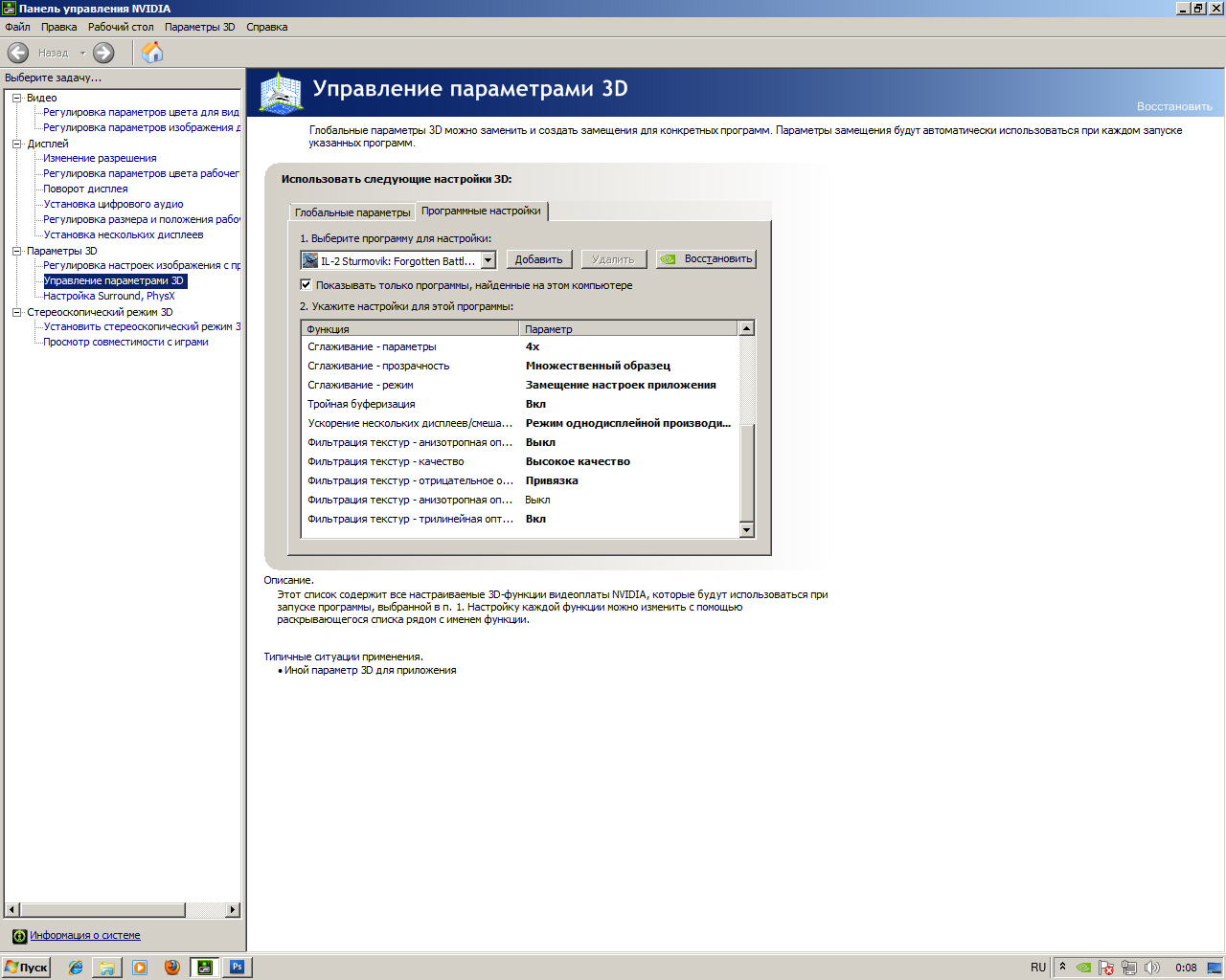 [Render_OpenGL] TexQual=3 TexMipFilter=3 TexCompress=2 TexFlags.UseDither=0 TexFlags.UseAlpha=0 TexFlags.UseIndex=0 TexFlags.PolygonStipple=0 TexFlags.UseClampedSprites=0 TexFlags.DrawLandByTriangles=0 TexFlags.UseVertexArrays=0 TexFlags.DisableAPIExtensions=0 TexFlags.ARBMultitextureExt=1 TexFlags.TexEnvCombineExt=1 TexFlags.SecondaryColorExt=1 TexFlags.VertexArrayExt=0 TexFlags.ClipHintExt=1 TexFlags.UsePaletteExt=0 TexFlags.TexAnisotropicExt=1 TexFlags.TexCompressARBExt=1 TexFlags.TexEnvCombine4NV=1 TexFlags.TexEnvCombineDot3=1 TexFlags.DepthClampNV=1 TexFlags.SeparateSpecular=1 TexFlags.TextureShaderNV=1 HardwareShaders=1 Shadows=2 Specular=3 SpecularLight=2 DiffuseLight=2 DynamicalLights=1 MeshDetail=2 VisibilityDistance=3 Sky=2 Forest=3 LandShading=3 LandDetails=2 LandGeom=3 LandGeom=3 TexLarge=1 TexLandQual=3 TexLandLarge=1 VideoSetupId=17 ForceShaders1x=0 PolygonOffsetFactor=-0.15 PolygonOffsetUnits=-3.0 Water=4 Effects=2 И в панели управления NVIDIA надо при настройке переходить в "Программные настройки" там в окне выбирать путь к файлу EXE от ИЛ-2 Таким образом ты выставишь оптимальные настройки ТОЛЬКО для ИЛ-2. У тебя насколько я вижу на скринах все меняется в "Глобальных параметрах" Тоесть ДЛЯ всего !!! с чем работает видеокарта, иногда это не ЕСТЬ ГУТ в других случаях (не ИЛ-2). Вообщем попробуй с указанными выше параметрами в конфиге, а то у тебя и геометрия ландшафта не на макс выставлена была,да еще и стояло "Отображать простыми треугольниками" ПЫ СЫ Я вообще на 460 GTX летаю с: PolygonOffsetFactor=-0.015 PolygonOffsetUnits=-1.0 Последний раз редактировалось carsmaster; 27.02.2013 в 00:00. |