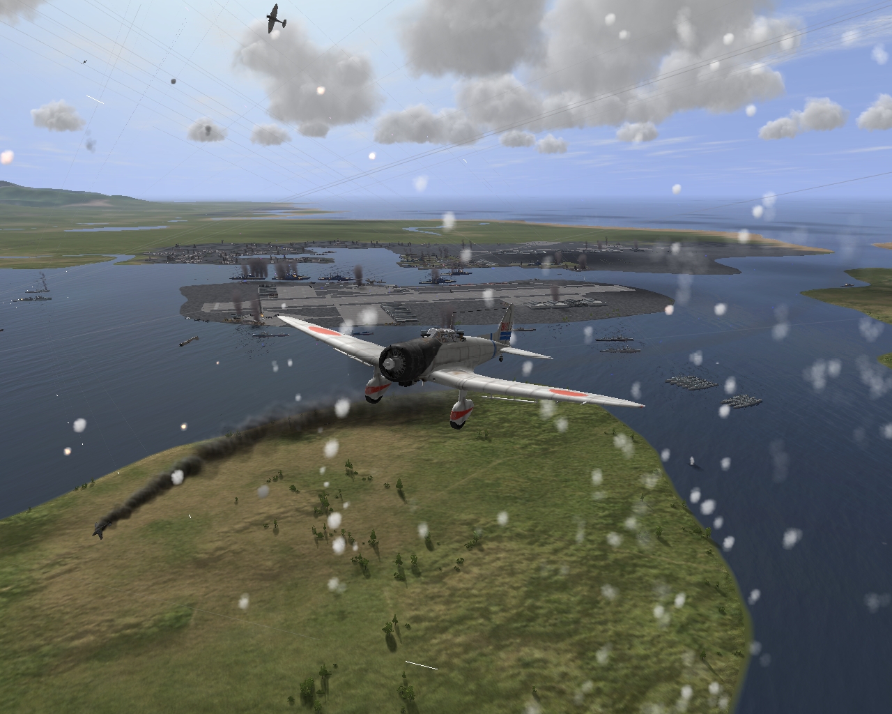 Миссия "Налёт на Перл-Харбор. Вторая волна" на D3A1. Обстановка в гавани воссоздана на основе фотографий. К сожалению, ввиду накладываемых игрой ограничений там нельзя размещать движущиеся корабли, поэтому линкор, изображающий "Неваду" остаётся неподвижным на фарватере.