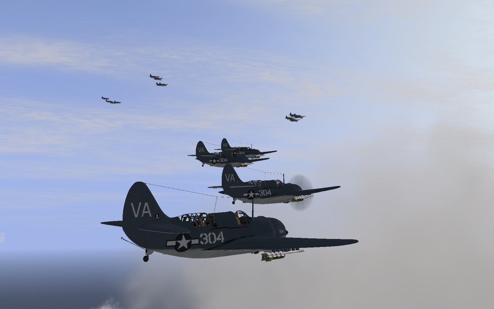 Кампания семимильными шагами приближается к релизу, и я хочу представить нового, и как я думаю, последнего героя в кампании - SB2C Helldiver. Пак Хэллдайверов выпущен кажется всего пару месяцев назад (лежит тут в соведней теме), а у меня в кампании летает уже во всю! Что лично меня радует больше всего - комплект самолетов в HSFX настолько удачен для Пацифика, что Хэллдайвер фактически оставался последним самолетом, которого не хватало для полноценного моделирования ТВД, конечно, если говорить про основных "игроков". Боевой применение SB2C покажу на примере атаки конвоя, у южного побережья Кюсю. В марте 1945 американцы усиленно атаковали там судоходство, чтобы не допустить переброски подкреплений на Окинаву, куда было запланировано вторжение Итак, поехали! Эскадрильи Хэллдайверов собрались после взлета, и отправляются к Кюсю. По дороге прикрышка как обычно ХЗ чем занималась, и японские истребители слегка потрепали ударную группу. Однако большинство пикировщиков таки лобралось к цели.