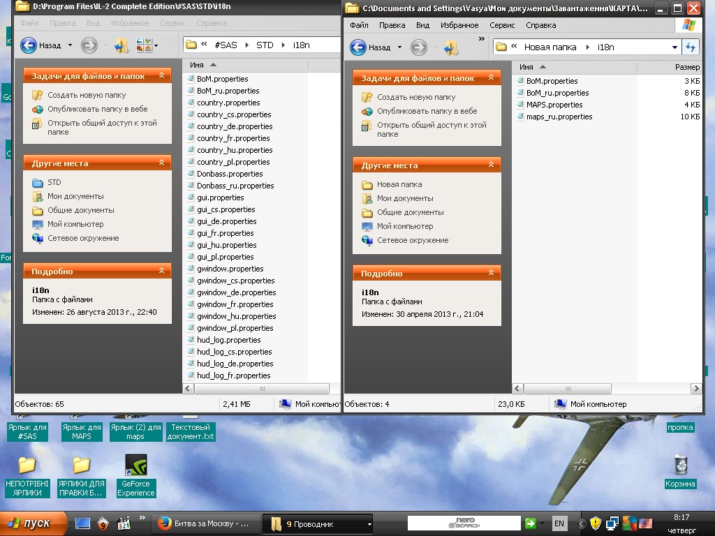 авторам этой очень нужной в нашем любимом "иле" карты Битвы за Москву(без лапок - ибо битва была в своё время грандиозная) - за мои, может быть, не совсем хорошие замечания и эпитеты. Так же - уважаемому Сергею - вэлыкий уклин за советы и помощь мне в установке и нормальной работе этой вышеназванной карты! Так же - огромная благодарность всем кто откликнулся и написал тут свои советы и замечания! ![]() Прописал - как велел уважаемый Де Сад - объекты карты в начало static.ini - так же - прописал объекты, начиная с Донбасса в файл static.ini.bak, который предлагался с Объектспаком на САСе. Смог долететь от Ельни до Москвы на скорости изображения плюс 4., над Москвой летал на нормальной скорости - делал паузы для скриншотов - изображение приемлемо по качеству, хотя на пределе - ядро не вытягивает до конца - явных тормозов не наблюдалось. Всё понравилось - сдался в плен(рус гут - по Доре не стрелял, авось накормит, а то уже в Люфтваффе со щи напряг ). Скришоты: - http://rghost.ru/48707163 - .Ещё раз - всем спасибо за внимание и терпение - и совет! П.С. В оправдание: я человек не конфликтный(хочу быть таким), но тоже человек, бывает обижаюсь, но хочу со всеми тут на сайте жить и общаться дружно. ![]()