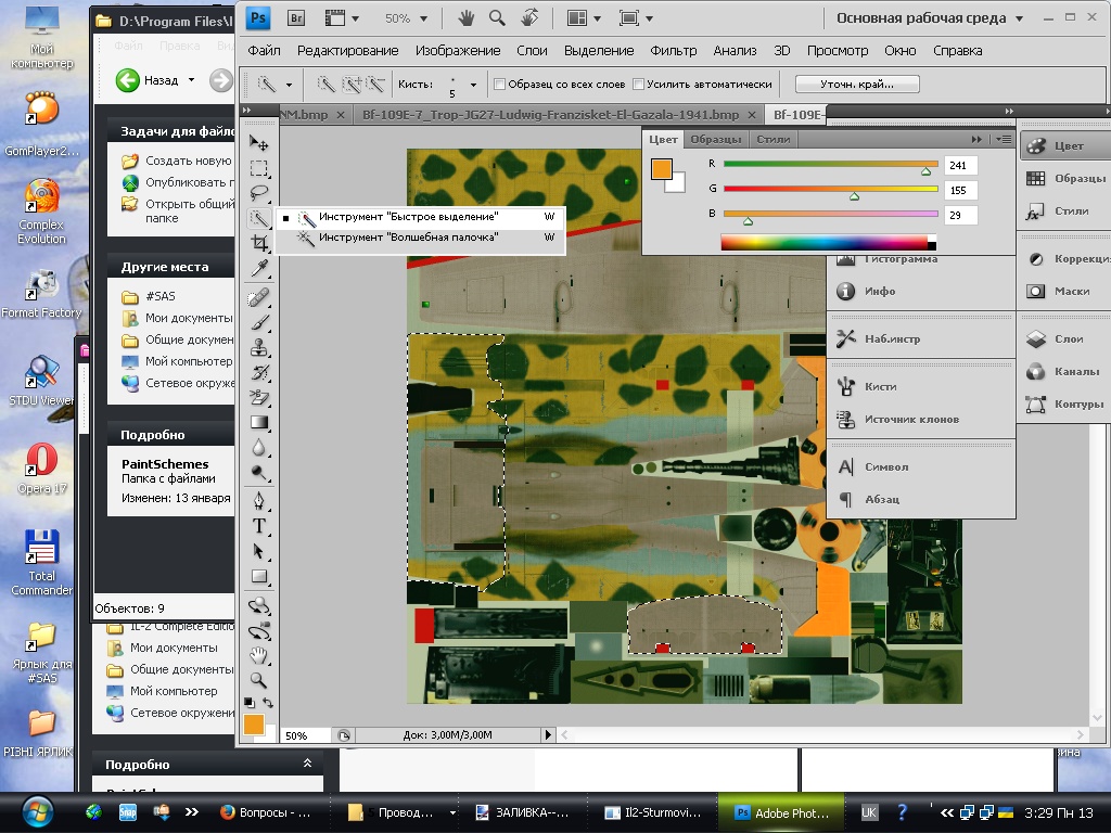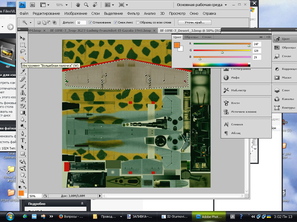 Пока ковырял значки, зацепил и скины - как выглядят - на картинках вверху., хотелось бы чуть сказать как на скорую руку подкрасить скин, если не устраивает цвет: в фотошопе использую волшебную палочку для выделения нужных областей, так же, быстрое выделение., потом делаю заливку скина или выделенной области каким либо цветом с 10 проц. прозрачностью варьируя мягкий, жёсткий цвета, затемнение и т.д., можно в режиме РГБ подобрать цвет от другого скина по вкусу., иногда всё же приходиться потом покрывать и заливкой то зелёного, то оранжевого цветов что бы придать нужный одтенок скину., заливать приходиться по несколько раз для нужного эффекта. Это так - типа подправляю на свой вкус и расцветку в стиле: "а мне так нравиться". Я никаким боком не скинодел - просто баловство., скинов кубометров лежат по сайтах, но бывает что скин в общем нравиться, но местами хочеться подправить. Для тех кто сам не рысует скины(как я) прикрепил картинки как подправить/переделать (цветовую гамму для себя по быстрому) любимый скин. Может кому пригодиться мой маленький опыт.