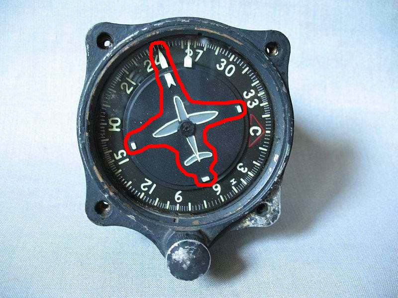 Сам самолётик подвижный, это и есть курс самолёта. Стрелка застывшая на 2 это и есть радиокомпас, стрелка подвижна на все 360 гр. шкалы. То что С взята в красный треугольник это для того что бы летчик беглым взглядом по приборам смог быстро определить и найти букву С на шкале. Внизу под шкалой рукоятка кремальеры, для попраавки компаса.