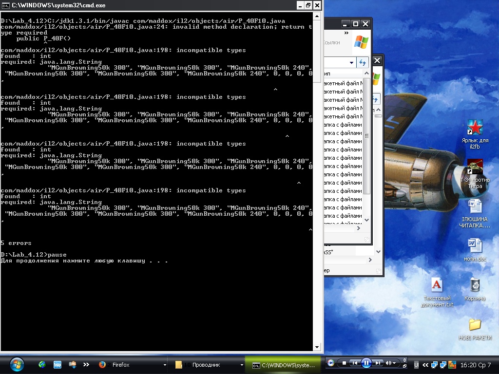 ==================================== Почему так? Мне очень хочеться что бы не только я разбирался в классах., для этого нужно потрудиться, тщательно переписовать цифирь в джава-файлах, анализировать что и куда записуеться - после трудов приходит понимание и радость что уже чего то сам можешь. Компилятор висит на Запасном Аэродроме., для правильной компиляции нужно создавать среду - дехешировать классы Модакта, почти все, так же енжин-мода и несколько повкидать классов от патча 4.12.2. Компилировать не сложно, но нужно много терпения и анализа ошибок. ========================= Закомпилировал джава-файл для Р-40Д в двух(+Нью) вариантах - один ссылаеться на дефолтную фм Р-40Е. Исходники GUZKNIFE прикрепил внизу - в них есть разница относительно записи вооружения. Плиз. Последний раз редактировалось Vasya; 07.05.2014 в 22:43. Причина: ПРИКРЕПЛЕНИЕ ФАЙЛА |