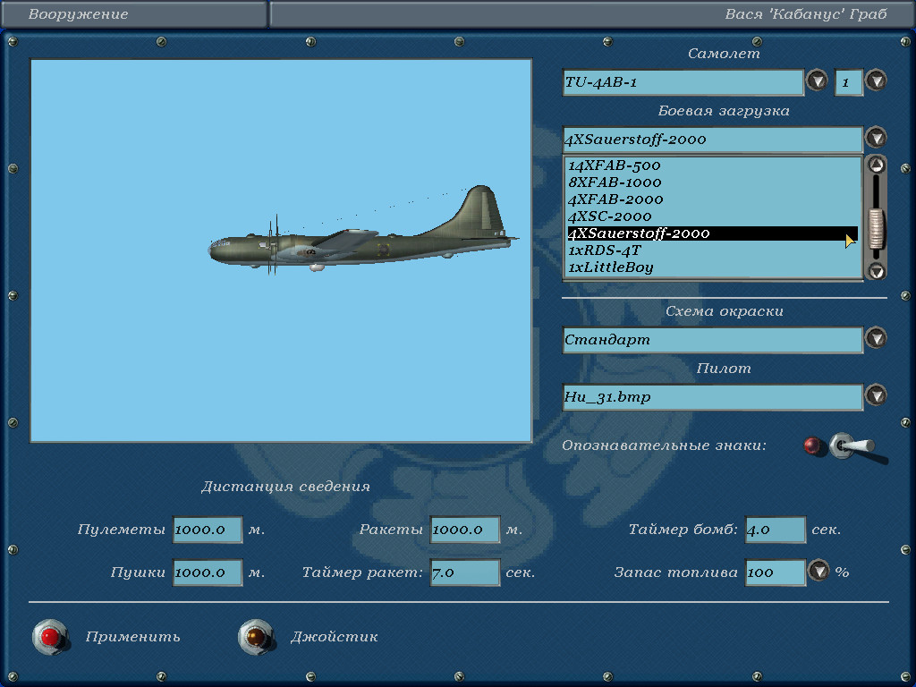 Предлагаю модификацию Ту-4АБ(Атомный Бомбандировщик) - поборол проблемму залипания кнопки., проверял работоспособность на патче 4.10.1., но класс Ту-4АВ был зашит в среде 4.12.2 для работы и в этом патче. Добавлены в список вооружения несколько бомб - Литл Бой. в том числе. У меня нормально проявляеться кабина и оригинальный фюзеляж. Брать исходный мод тут: