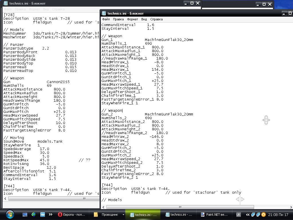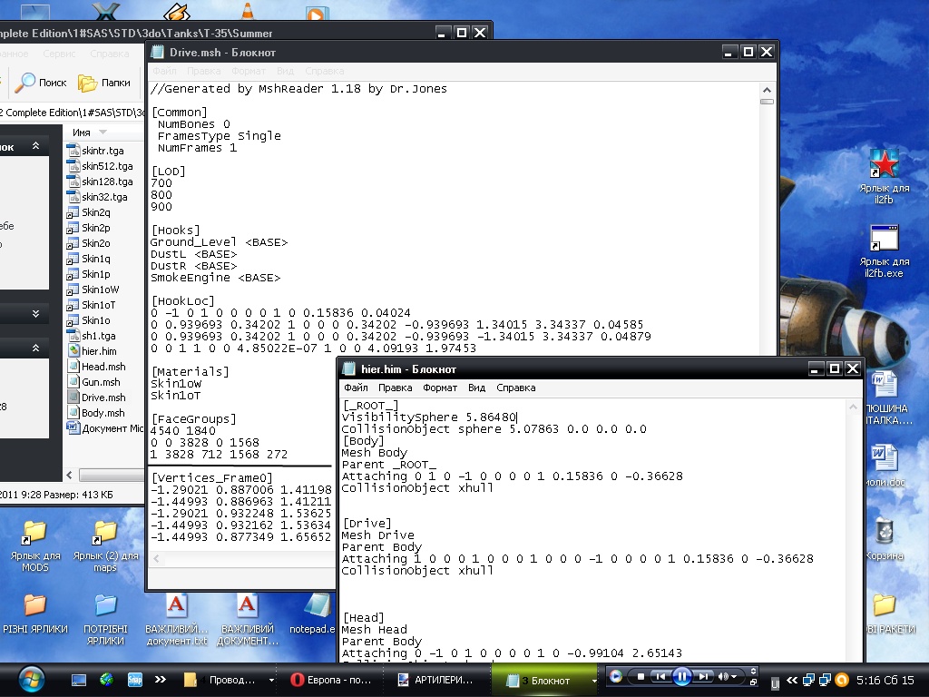 Почему я о классах завёл речь - мне нужно было приделать к зенитному танку МК-213, не изменяя дефолтного, как бы дополнительным модом. Поэтому и пришлось это дело допысывать в класс артилерии., это кроме записи в техникс и написания отдельного класса таковой пушки для зенитного танка., в общем что бы всё было по уму и работало без глюков. Так вот - ели бы я имел переведённые в Ил из другой игры меши танков, то следовало бы начать из классов - посмотреть что и как называеться, там есть интересные важные пометки, потом смотреть в техникс.ини - там тоже интересные вещи написаны - как и куда стреляет и как крутяться меши., при модернизации дефолта можно обойтись и техникс.ини, но исходя из записей в техникс.ини Ил по своим правилам и будет пытаться отобразить и запустить в движении те меши что назвали, допустим Т-35, считывая в мешах цыфирь там написанную. Что бы анимировать движение гусеницы - это уже нужно переписывать кучу классов - тапл, вектор и т.д., к изучению чего я даже и не приступал. В общем так - если автор только перевёл 3До танков в Иловские меши, они должны быть построены по правилам - в смысле те строки в техникс.ини должны иметь соответствие в хуках - чего по логу не наблюдаеться. [21:54:04] Hook: Gun_1 not found [21:54:04] com.maddox.il2.engine.ActorException: Hook: Gun_1 not found Ну а дальше Ил рассказывает что мол при создании миссии при попытке отобразить Т-28-35 он столкнулся с проблеммой такого то несоответствия и в конце так и пишет - мол ваши меши таки малость ф...о, не кондицийни , в общем - не могу зоздать артилерию обьекта. at com.maddox.il2.game.GameWin3D.main(GameWin3D.java: 235) [21:53:54] SPAWN: Can't create Artillery object [class:com.maddox.il2.objects.vehicles.artillery.Ar tillery$T28]. Простите за некоторую грубость. ![]() Возможно дописка хука решит проблемму - если все остальные меши этих двух танков прописаны правильно.И ещё - этот мой пост не в той теме мной писан - так что можно перенести туда, куда это будет более правильно.