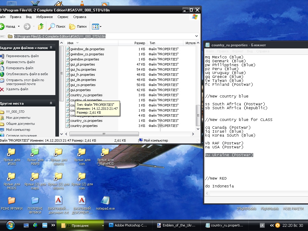 Прошу помощи грамотных, особенно Скворца - в вопросе мода разных стран. На патч 4.12.2 попробовал поставить вот этот мод: - http://forum.aviaskins.com/showpost....1&postcount=90 - ., страна Ураина поствар проявилась, но значки нет., пропертисы вкинул в папку i18n в STD, папочки decals, Red, Blue и regiments.ini вкинул в PaintSchemes., папка PaintSchemes у меня находится и возле сфс-ок и в папке САС, причём одинаковые(та что в САС без скинов)., часа 3 совмещал туды-сюди(аж уприв), но всё равно в итоге получился череп с костями