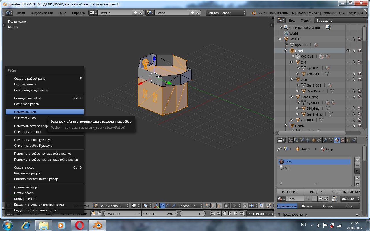 И вот почему, бленди-экспортёр изначально не экспортирует материалы. Мы можем назначить материалы определённым полигонам, блендер позволяет использовать несколько материалов на одном объекте, но свойства материалов не экспортируются. ОГРОМНЫЙ минус. Материалы приходится подбирать из стандартных материалов Ил-а. Текстурирование имеет те же принципы, что и в Максе. В режиме редактирования, создаём UV развертку. Нарезаем будущие объекты с помощью команды выделить шов (см скрин3). Делим экран на две части на одной половине открываем редактор UV изображений в котором разворачиваем созданные развертки, на другой работаем с объектом. (скрин1). Мелкокалиберное вооружение и модели экипажа, я делаю отдельными моделями со своими материалами и текстурами, пригодится в других проектах(скрин2). Смесь лени, острого недостатка времени помноженное на отсутствие таланта художника, сподвигли меня на злобный плагиат . Конечно если бы знать авторов Смоленска и Индианаполиса, если бы была возможность спросить разрешения на использование их работы... Но все мои усилия по их поиску прошли даром. Если Красный Крым нарисовал сам, то в проекте Бруклин во всю использовал скин Индианаполиса. Все равно получилось лучше, чем рисовал бы сам. Проект Железняков не стал исключением, за основу был взят скин Смоленска и полностью переработан под Железняков. Если воспользовался скином Смоленска, грешно не позаимствовать и его вооружение. То есть выполнить импорт сторонних моделей в Блендер. Но об этом в следующем посте.