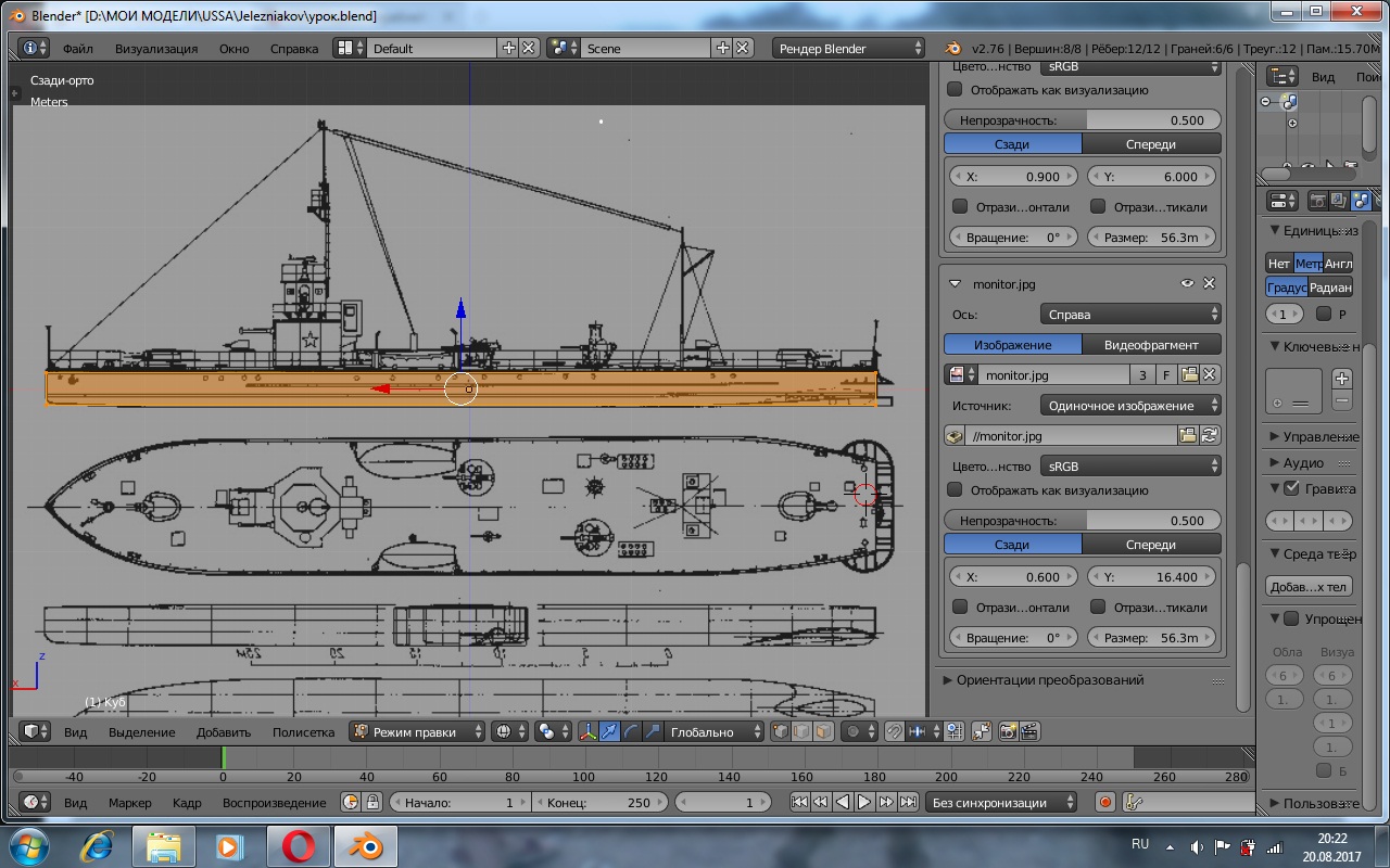 Вообще Блендер я знаю плохо... Хорошо если треть или четверть его возможностей... По этому всё, что я здесь напишу это скорее наблюдения и размышления, но никак не уроки. Работаю в Блендере 2.76. Английский знаю плохо ![]() Старая версия под, Блендер 2.49 SAS Текстуры рисую в Гимп 2.8. То есть всё программное обеспечение в свободном доступе и бесплатное. Хочу создать модель монитора "Железняков" для Ил-2. 1. С чего начинается создание мода? Правильно с поиска информации, в частности нормальных чертежей. Спасибо коллегам по форуму, чертежи нашлись. Очень могут помочь сканы бумажных моделей, пара часов работы в Гимп-е и можно собрать отличный теоретический чертеж корпуса. Да и в работе с надстройками бумажная модель тоже поможет. 2. Определяемся с размерами модели, у "Железнякова" Д*Ш*О=51.2*8.2*0.88 м. Открываем Блендер, удаляем всё, что есть в окне вида, добавляем в сцену куб.(скр1.) В меню "сцена" в единицах измерения ставим метры. Жмем N на английской раскладкае клавиатуры, и в выпадающем меню преобразований видим размеры нашего куба, сторона куба равна двум метрам. (скр2.) Меняем размеры куба, длинна по х, ширина у. Мы не знаем высоты надводного борта, но знаем осадку, задаём осадку по оси z, потом подгоним высоту борта по чертежу. В итоге у нас есть основные размеры корпуса в метрах. 3. Размещаем чертёж. Для нормальной работы нужны вид сверху, снизу, сбоку, плюс теоретический чертеж корпуса. В выпадающем меню справа (кнопка N) внизу есть вкладка "фоновые изображения". Ставим галочку, жмакаем добавить изображение-открыть. Открываем изображение. (скр3.) В меню "вид" выбираем вид "сзади" этот вид соответствует виду с левого борта, почему так, не знаю. В "фоновых изображения тоже выбираем вид сзади. Открываем изображение нужного чертежа. Включаем прозрачность (кнопка Z), (скр4.) масштабируем и перемещаем изображение, до нужного результата. И так по всем видам, поперечные срезы теоретического чертежа помещаем на виде спереди. Пока вот так, если что не ясно задавайте вопросы, постараюсь ответить. Тo be continued. Последний раз редактировалось tvister; 08.09.2018 в 03:48. |