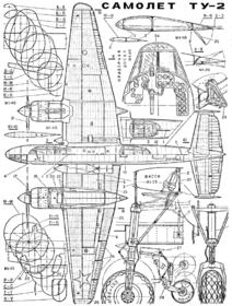 Мда, проблема найти нормальные чертежи Ту-2... Самый подробный чертёж из МК, но и тот кривой. Вид спереди не совпадает с видом сбоку, а вид сверху не совпадает с ними обоими. Я уж молчу про то, что одно крыло там обрезано... И непонятно, для какого вида сделан масштаб, поскольку вид сбоку и спереди расположены на одном листе и не совпадают друг с другом. Есть чертежи из книг, но там нет продольного разреза, на котором видно где находятся лонжероны...