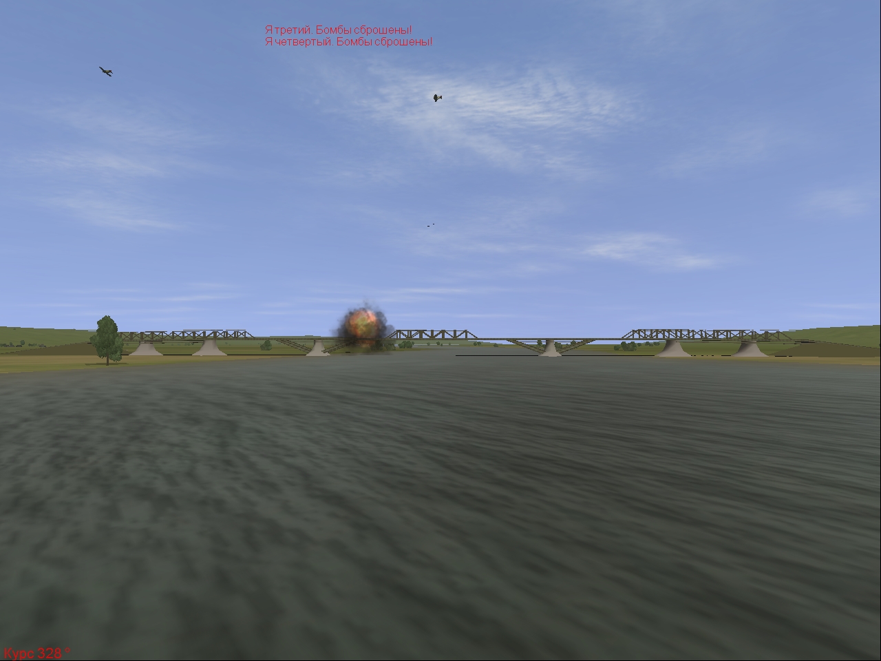 2) По мосту пыскаем колонну (или поезд, если мост ж/д), подгадав время атаки истребителей к времени прохода цели по мосту. Даем целеуказание на то, что движется по мосту. В результате атаке подвергается тезника на мосту и сам мост заодно (см. скрин).