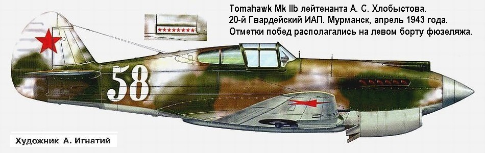 "Имхо более типичным для Томагавка в ВВС КА является окрас американскими красками по британской спецификации (Tomahawk IIB- Dark Green / Dark Earth / Sky Blue - поскольку большая часть поставленных в СССР Р-40 попадала к нам из Англии (т.к. строилась и красилась по британскому заказу, для RAF), и к нам приходила в британском камуфляже, с кокардами и с серийными номерами у стабилизатора (могла быть также полоса цвета Sky перед стабилизатором и кок того же цвета). Однако USAAFовские P-40C типа описанного здесь - http://lend-lease.airforce.ru/englis...very/index.htm