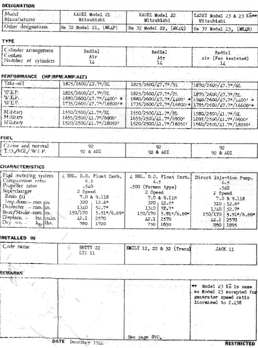 Sources: Matsuoka Hisamitsu, Nakanishi Masayoshi, The History of Mitsubishi Aero Engines 1915-1945, Miki Press, Japan, 2005. ISBN 4-89522-461-9