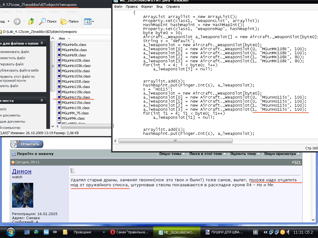 Эта пушка есть в Игре и в дефолте, то есть самолёт должен летать и стрелять без всяких модов вооружения. Скрины класса прилагаю. Я не могу знать почему у вас сборка не хочет видеть вооружение вшитое в дефолтную игру.Даже в растерянности. ![]() ========================================= Вот дефолтное вооружение: Aircraft.weaponTriggersRegister(class1, new int[] { 0, 0, 1, 1, 9, 9, 2, 2, 2, 2, 2, 2, 2, 2, 2, 2, 2, 2, 2, 2, 2, 2, 2, 2, 2, 2, 2, 2, 2, 2 }); Aircraft.weaponHooksRegister(class1, new String[] { "_CANNON01", "_CANNON02", "_CANNON03", "_CANNON04", "_ExternalDev01", "_ExternalDev02", "_ExternalRock01", "_ExternalRock02", "_ExternalRock03", "_ExternalRock04", "_ExternalRock05", "_ExternalRock06", "_ExternalRock07", "_ExternalRock08", "_ExternalRock09", "_ExternalRock10", "_ExternalRock11", "_ExternalRock12", "_ExternalRock13", "_ExternalRock14", "_ExternalRock15", "_ExternalRock16", "_ExternalRock17", "_ExternalRock18", "_ExternalRock19", "_ExternalRock20", "_ExternalRock21", "_ExternalRock22", "_ExternalRock23", "_ExternalRock24" }); Aircraft.weaponsRegister(class1, "default", new String[] { "MGunMK108k 100", "MGunMK108k 100", "MGunMK108k 80", "MGunMK108k 80", null, null, null, null, null, null, null, null, null, null, null, null, null, null, null, null, null, null, null, null, null, null, null, null, null, null }); Aircraft.weaponsRegister(class1, "24r4m", new String[] { "MGunMK108k 100", "MGunMK108k 100", "MGunMK108k 80", "MGunMK108k 80", "PylonMe262_R4M_Left", "PylonMe262_R4M_Right", "RocketGunR4M 1", "RocketGunR4M 1", "RocketGunR4M 1", "RocketGunR4M 1", "RocketGunR4M 1", "RocketGunR4M 1", "RocketGunR4M 1", "RocketGunR4M 1", "RocketGunR4M 1", "RocketGunR4M 1", "RocketGunR4M 1", "RocketGunR4M 1", "RocketGunR4M 1", "RocketGunR4M 1", "RocketGunR4M 1", "RocketGunR4M 1", "RocketGunR4M 1", "RocketGunR4M 1", "RocketGunR4M 1", "RocketGunR4M 1", "RocketGunR4M 1", "RocketGunR4M 1", "RocketGunR4M 1", "RocketGunR4M 1" }); Aircraft.weaponsRegister(class1, "none", new String[] { null, null, null, null, null, null, null, null, null, null, null, null, null, null, null, null, null, null, null, null, null, null, null, null, null, null, null, null, null, null }); } } Я написал вооружение общепринятым способом в модных самолётах: Aircraft.weaponTriggersRegister(class1, new int[] { 0, 0, 1, 1, 9, 9, 2, 2, 2, 2, 2, 2, 2, 2, 2, 2, 2, 2, 2, 2, 2, 2, 2, 2, 2, 2, 2, 2, 2, 2 }); Aircraft.weaponHooksRegister(class1, new String[] { "_CANNON01", "_CANNON02", "_CANNON03", "_CANNON04", "_ExternalDev01", "_ExternalDev02", "_ExternalRock01", "_ExternalRock02", "_ExternalRock03", "_ExternalRock04", "_ExternalRock05", "_ExternalRock06", "_ExternalRock07", "_ExternalRock08", "_ExternalRock09", "_ExternalRock10", "_ExternalRock11", "_ExternalRock12", "_ExternalRock13", "_ExternalRock14", "_ExternalRock15", "_ExternalRock16", "_ExternalRock17", "_ExternalRock18", "_ExternalRock19", "_ExternalRock20", "_ExternalRock21", "_ExternalRock22", "_ExternalRock23", "_ExternalRock24" }); try { ArrayList arraylist = new ArrayList(); Property.set(class1, "weaponsList", arraylist); HashMapInt hashmapint = new HashMapInt(); Property.set(class1, "weaponsMap", hashmapint); byte byte0 = 30; Aircraft._WeaponSlot a_lweaponslot[] = new Aircraft._WeaponSlot[byte0]; String s = "default"; a_lweaponslot = new Aircraft._WeaponSlot[byte0]; a_lweaponslot[0] = new Aircraft._WeaponSlot(0, "MGunMK108k", 100); a_lweaponslot[1] = new Aircraft._WeaponSlot(0, "MGunMK108k", 100); a_lweaponslot[2] = new Aircraft._WeaponSlot(1, "MGunMK108k", 80); a_lweaponslot[3] = new Aircraft._WeaponSlot(1, "MGunMK108k", 80); for(int i = 4; i < byte0; i++) a_lweaponslot[i] = null; arraylist.add(s); hashmapint.put(Finger.Int(s), a_lweaponslot); s = "HO115"; a_lweaponslot = new Aircraft._WeaponSlot[byte0]; a_lweaponslot[0] = new Aircraft._WeaponSlot(0, "MGunHo115s", 100); a_lweaponslot[1] = new Aircraft._WeaponSlot(0, "MGunHo115s", 100); a_lweaponslot[2] = new Aircraft._WeaponSlot(1, "MGunHo115s", 100); a_lweaponslot[3] = new Aircraft._WeaponSlot(1, "MGunHo115s", 100); for(int i1 = 4; i1 < byte0; i1++) a_lweaponslot[i1] = null; arraylist.add(s); hashmapint.put(Finger.Int(s), a_lweaponslot); s = "MK108_24r4m"; a_lweaponslot = new Aircraft._WeaponSlot[byte0]; a_lweaponslot[0] = new Aircraft._WeaponSlot(0, "MGunMK108k", 100); a_lweaponslot[1] = new Aircraft._WeaponSlot(0, "MGunMK108k", 100); a_lweaponslot[2] = new Aircraft._WeaponSlot(1, "MGunMK108k", 80); a_lweaponslot[3] = new Aircraft._WeaponSlot(1, "MGunMK108k", 80); a_lweaponslot[4] = new Aircraft._WeaponSlot(9, "PylonMe262_R4M_Left", 1); a_lweaponslot[5] = new Aircraft._WeaponSlot(9, "PylonMe262_R4M_Right", 1); a_lweaponslot[6] = new Aircraft._WeaponSlot(2, "RocketGunR4M", 1); a_lweaponslot[7] = new Aircraft._WeaponSlot(2, "RocketGunR4M", 1); a_lweaponslot[8] = new Aircraft._WeaponSlot(2, "RocketGunR4M", 1); a_lweaponslot[9] = new Aircraft._WeaponSlot(2, "RocketGunR4M", 1); a_lweaponslot[10] = new Aircraft._WeaponSlot(2, "RocketGunR4M", 1); a_lweaponslot[11] = new Aircraft._WeaponSlot(2, "RocketGunR4M", 1); a_lweaponslot[12] = new Aircraft._WeaponSlot(2, "RocketGunR4M", 1); a_lweaponslot[13] = new Aircraft._WeaponSlot(2, "RocketGunR4M", 1); a_lweaponslot[14] = new Aircraft._WeaponSlot(2, "RocketGunR4M", 1); a_lweaponslot[15] = new Aircraft._WeaponSlot(2, "RocketGunR4M", 1); a_lweaponslot[16] = new Aircraft._WeaponSlot(2, "RocketGunR4M", 1); a_lweaponslot[17] = new Aircraft._WeaponSlot(2, "RocketGunR4M", 1); a_lweaponslot[16] = new Aircraft._WeaponSlot(2, "RocketGunR4M", 1); a_lweaponslot[17] = new Aircraft._WeaponSlot(2, "RocketGunR4M", 1); a_lweaponslot[18] = new Aircraft._WeaponSlot(2, "RocketGunR4M", 1); a_lweaponslot[19] = new Aircraft._WeaponSlot(2
