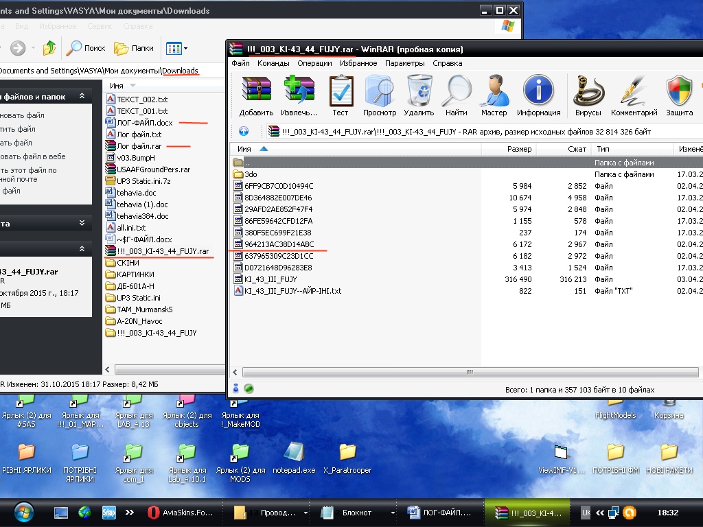 Согласно вашего лога: Main begin: PlMisAir: class 'air.KI_43_III_FUJY' not found java.lang.RuntimeException: PlMisAir: class 'air.KI_43_III_FUJY' not found at com.maddox.il2.gui.GUIQuick.fillArrayPlanes(GUIQui ck.java:1064) at com.maddox.il2.gui.GUIQuick.<init>(GUIQuick.java:1 841) at com.maddox.il2.gui.GUI.create(GUI.java:160) at com.maddox.il2.game.Main3D.beginApp(Main3D.java:18 85) at com.maddox.il2.game.Main3D.beginApp(Main3D.java:15 79) at com.maddox.il2.game.MainWin3D.beginApp(MainWin3D.j ava:212) at com.maddox.il2.game.Main.exec(Main.java:432) at com.maddox.il2.game.GameWin3D.main(GameWin3D.java: 235) у вас не хватает одного класса(хеша номер - 964213AC38D14ABC). Должно быть в папке с модом 8 хешей. Картинки визу прикрепил как свидетельство что в архив положил всё. ================================= Ещё раз просмотрел ваш лог - оказываеться у вас вообще не положены в модную папку все 4 хеша(класса) Ки-43-Ки-44. Потому как лог ругаеться на отсутствие этих классов. Пожалуйста скачайте архив и установите в свою модную папку папку под названием !!!_003_KI-43_44_FUJY. Если у вас не установлен Tainan_kosho_MOD - то можно внутренний архив плане распаковать и положить в любою папку 3До(в любое удобное для вас место - в любой 3До) в вашей сборке. Успехов!   Последний раз редактировалось Vasya; 31.10.2015 в 19:43. | |