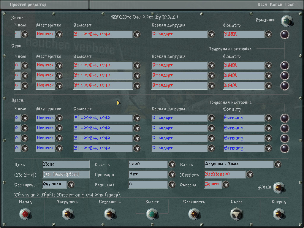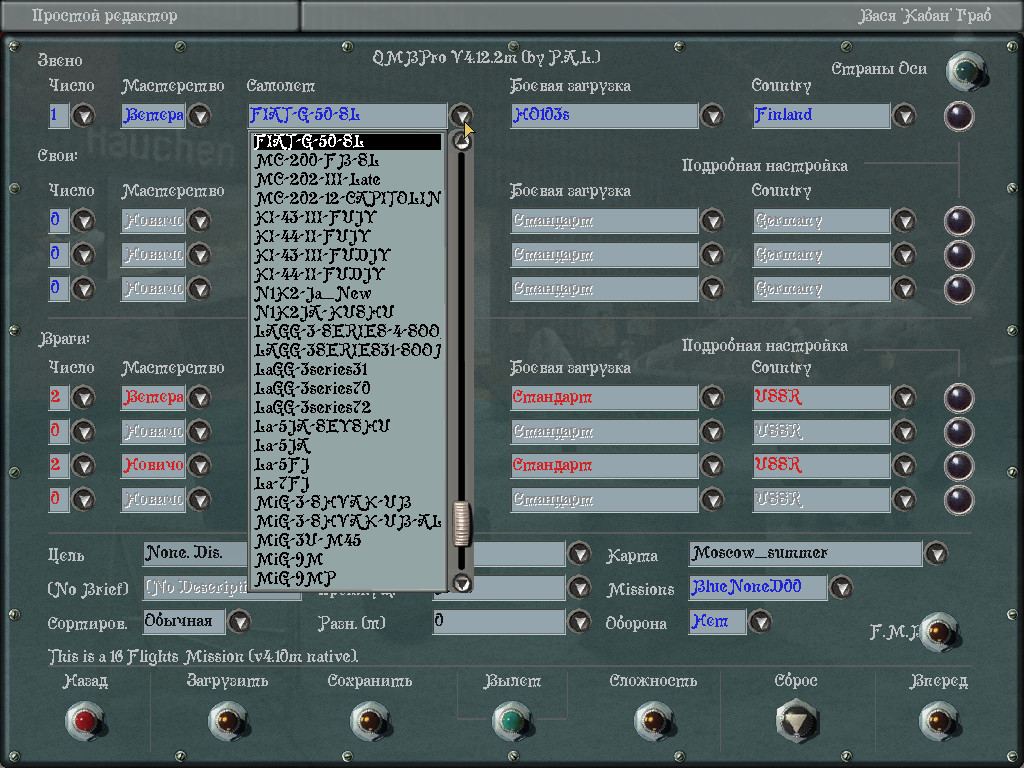 Вот вам ссылка: - http://rghost.ru/8YcxdzVbv - Я пересобрал начальную сборку и дополнил немного. Инструкция есть в папке СТД. Попробовал загрузить - всё грузиться, Ил краша не даёт. Картинка внизу - тому подтверждение. Ума не могу приложить почему у вас происходит краш при установке новых модов, в том числе и моих. Когда я выкладываю что то из модиков, то почти во всех есть в названии указка под какой патч они сделаны. Может быть что у вас есть в сборке два файла АЙР-ИНИ и Ил путаеться из какого читать названия классов. Судя по логам, что вы прыкрепляли тут - Ил просто не видит классов тех новых модных самолётов которые вы хотите прикрутить в свою сборку. Это может значит только одно: файлы новых модных самолётов поставлены не в ту папку в которых Ил пытаеться найти их в соответствии с записями в вашем АЙР-ИНИ. У меня установлен тот же САСовский Модакт 5.30, который позволяет легко и просто устанавливать моды от разных производителей, подключать разные сфс-ки, устанавливать легко и просто карты и т.д. Могу посоветовать ещё раз внимательно установить те моды которые дают краш Ила, положив их просто в папку #SAS, где и должны находиться все остальные моды предложенные вместе с Модактиватором, включая папку с енжин-модом. Постарался написать подробно. Напишите как получилось. Если скачаете мою папку #SAS по ссылке и поставите себе в Ил для експеремента - тоже напишите пожайлуста как установилось., если будет краш - прикрепите лог-файл. ---------------------------------------------- Пересобрал свой давнишний модик для небольших самолётов начала ВМВ., переписал вооружение - теперь нет ссылок на дефолтные классы вооружения - всё опираеться на мод Нью-Гарматы. Отрегулирована фм и емд. Модик на любителя разнообразить парк самолётов с разными характеристиками. У итальянцев мотор Пяджо-11бис на 96 бензине. У модернизированного финнами Р-40АС(оригинал мода тут: - http://www.sas1946.com/main/index.ph...c,14980.0.html -) захваченный у СССР Климов 105Р с немецким компрессором от ДБ-601А(высотность до 4600 метров, наддув на номинале 1.4 бара) - мощность на хорошем 96 бензине 1160 сил. На Моране(410) от финнов так же стоит Климов-105 с компрессором от ДБ-601А, но этот мотор мение форсирован., на номинале 1075 сил., высотность так же 4600 метров. Такие фантазии на тему 41 года. ------------------------------------------- ИЩО фантазии можно почитать тута: - http://fai.org.ru/forum/topic/29649-...-aerodinamiki/ - . Фридрих-3: - http://www.sas1946.com/main/index.php/topic,28.0.html -. Последний раз редактировалось Vasya; 14.11.2015 в 05:25. |