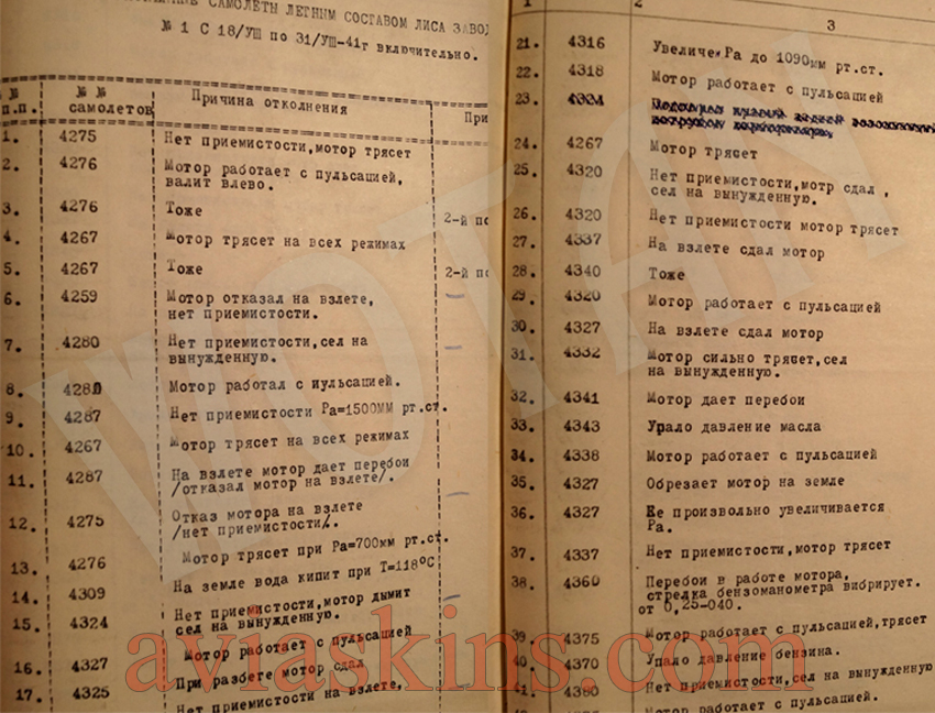 Это отчёты о работе завода и Военного Представительства ГУВВС КА, ст. военпреда завода №1 военинженера 2 ранга Францева начальнику 2-го отдела 10-го управления ГУВВС КА военинженеру 1 ранга Алексееву, директору завода №1 Третьякову, а также ст. военпреду завода №24. Там вообще много всяких подробностей по дефектам, написано, сколько заводских бригад и каким составом, работают в строевых частях по восстановлению мат-части. Жалоба на то, что систематически повторяющиеся дефекты так и не устраняются, при этом видно, что дефект с плохой приемистостью мотора и тряской, за месяц вырос в два раза и т.д. Отдельные листы облёта на конкретные самолёты. Всё конечно выкладывать нельзя, но вот пример из повторной сдачи МиГа №4371. Его несколько дней пытались облетать разные лётчики, и каждый раз в заключении одно и тоже (ППЦ), один раз закончилось вынужденной посадкой.