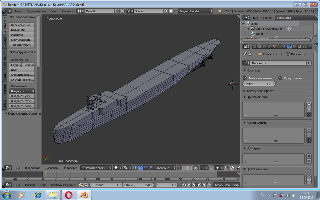 Таких "знаков" было предостаточно, и всё со скрипом и скрежетом преодолено. Еще это можно назвать упрямством или способностью достичь цели, смотря с какой стороны смотреть... Ещё одной причиной переделки модели является вечная проблема с чертежами. В своей работе я использовал чертежи из журнала Моделист-Конструктор 1\1993-3\1993. Но эти чертежи "описывают" Профинтерн то есть самое раннее состояние крейсера. К тому же они не совпадают с более поздними версиями чертежей именно Красного Крыма по обводам корпуса, расположению надстроек, артиллерии и мачт. Да и повторюсь, очень много ошибок, чисто технического плана, проявляющиеся в огромном количестве лишних полигонов. Во время работы я создаю архив в который сбрасываю этапы работы с моделью. Вот, взял корпус, уберу основные баги, подгоню "правильные" чертежи и за работу! Всем мира.