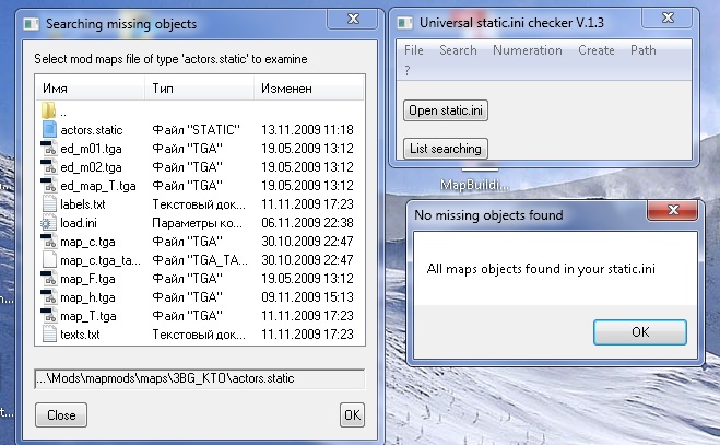 Запускаешь программку Нажимаешь Search ->...missing objects Появляется окошко,где просят ввести файл actors.static нужной тебе карты. Находишь его выделяешь нажимаешь ОК. Дальше просит выбрать вручную твой файл static.ini. Выбираешь, жмёшь ОК. Появляется окошко с результатами поиска(у меня все объекты данной карты присутствуют, поэтому и пишет, что недостающих объектов не нашёл) |