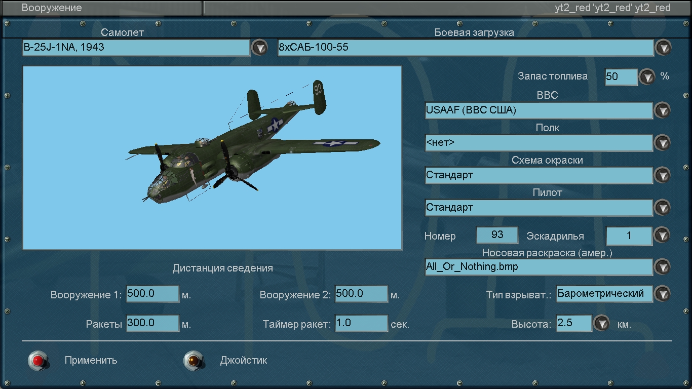 Список самолѐтов В правой нижней части первой страницы Простого редактора находится "выпадающее" меню - список самолѐтов "Сортировка". Доступны два типа списка: Обычная и Алфавитная. Если выбран первый, самолѐты в списке распо- ложены как обычно. Также можно составить два дополнительных списка самостоятельно: QMBair_2.ini и QMBair_3.ini. Поместите их в папку Missions/Quick/. Содержимое файлов должно выглядеть примерно так: [AIR] BeaufighterMk21 air.BEAU21 BlenheimMkIV air.BLENHEIM4 BI-1 air.BI_1 BI-6 air.BI_6 BuffaloMkI air.F2A_B339 Вы можете составить список исключительно из любимых самолѐтов, и только они будут появляться в "выпадающем" меню выбора самолѐта. |