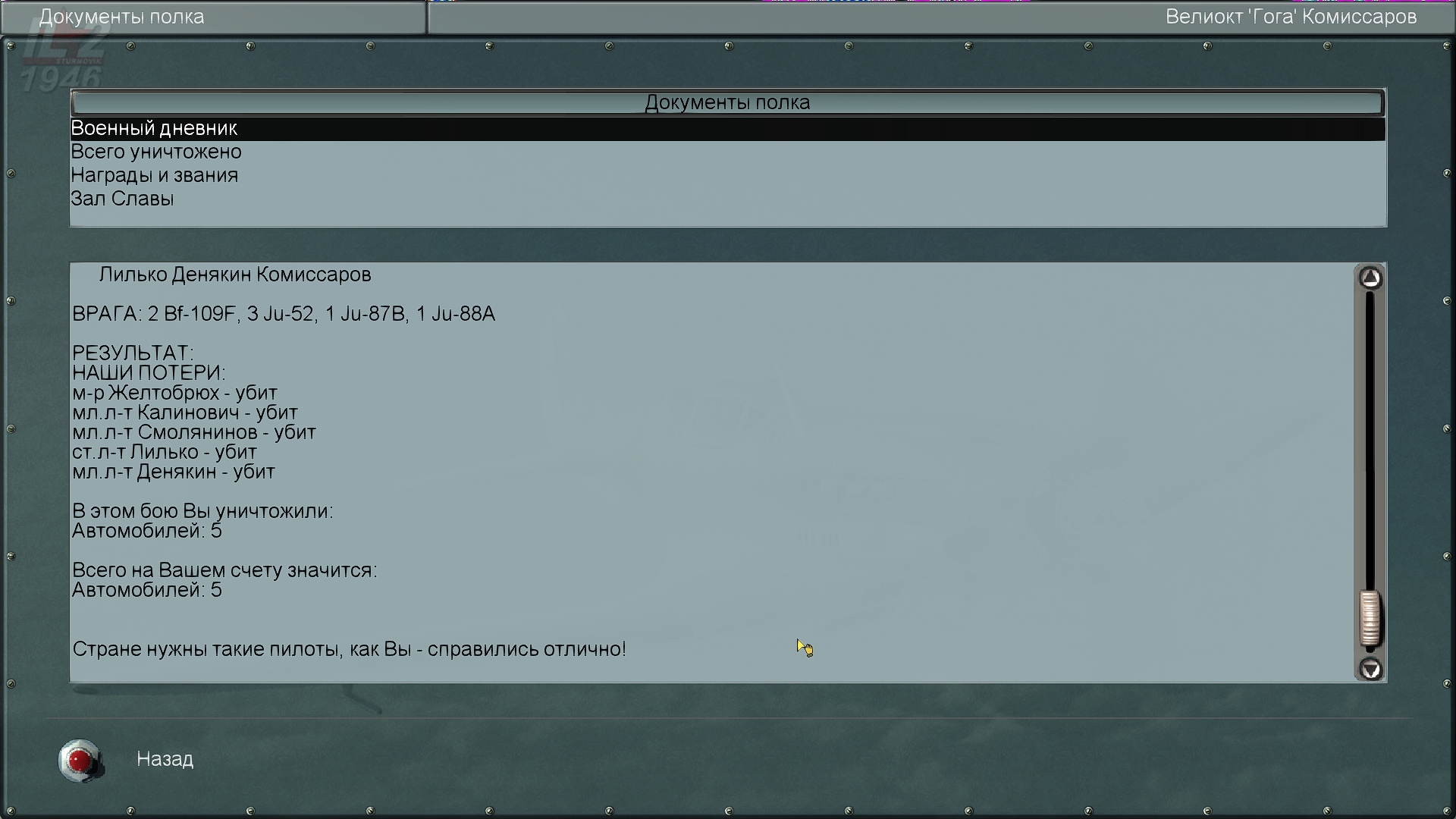 Так далеко еще и не забирался, все было в пределах Битвы за Смоленск (на Лаггах и Илах, слетели из-за мода погон), сейчас только Тульская операция на Мигах со Шваками капитан, комэск ( в первой миссии завалил 7 разных типов бошей и 4 в группе даже и не сильно халтуря -время 2х). 2-х своих потерял. Но отбомбиться по станции 3-я группа Юнкерсов все равно успевает, потому как Лагги-боты с эРэСами гоняют вместе с моими Мессов вместо бомберов, пришлось своих выводить в погоню (удивительно, но подчинились),только 2-е осталось (их и сбили). Так что основную задачу не выполнил. Но Красную Звезду все равно генератор выдал всем летчикам полка (даже тем, что не летали).