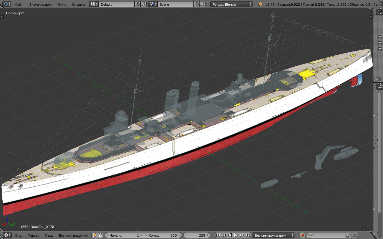 . Осталась вся артиллерия часть шлюпок и грот-мачта. Колижены готовы только для корпуса и дымовых труб. Необходимо перерисовать скины. В процессе работы из блендера исчезла вся зенитная артиллерия ближней и средней дальности. При этом, модель в игре появляется в полном составе, с рабочими зенитками. Одним словом "мистика"!!! И ещё один не понятный баг. При появлении корабля в поле зрения, игра начинает дико тормозить, и впоследствии не выключается. В чем проблема, пока не знаю... Закончу работу с лодами, тенями и коллиженами, выставлю модель в бета-версии, без перерисовки скинов. Может быть кто нибудь, что нибудь подскажет. Пока так...