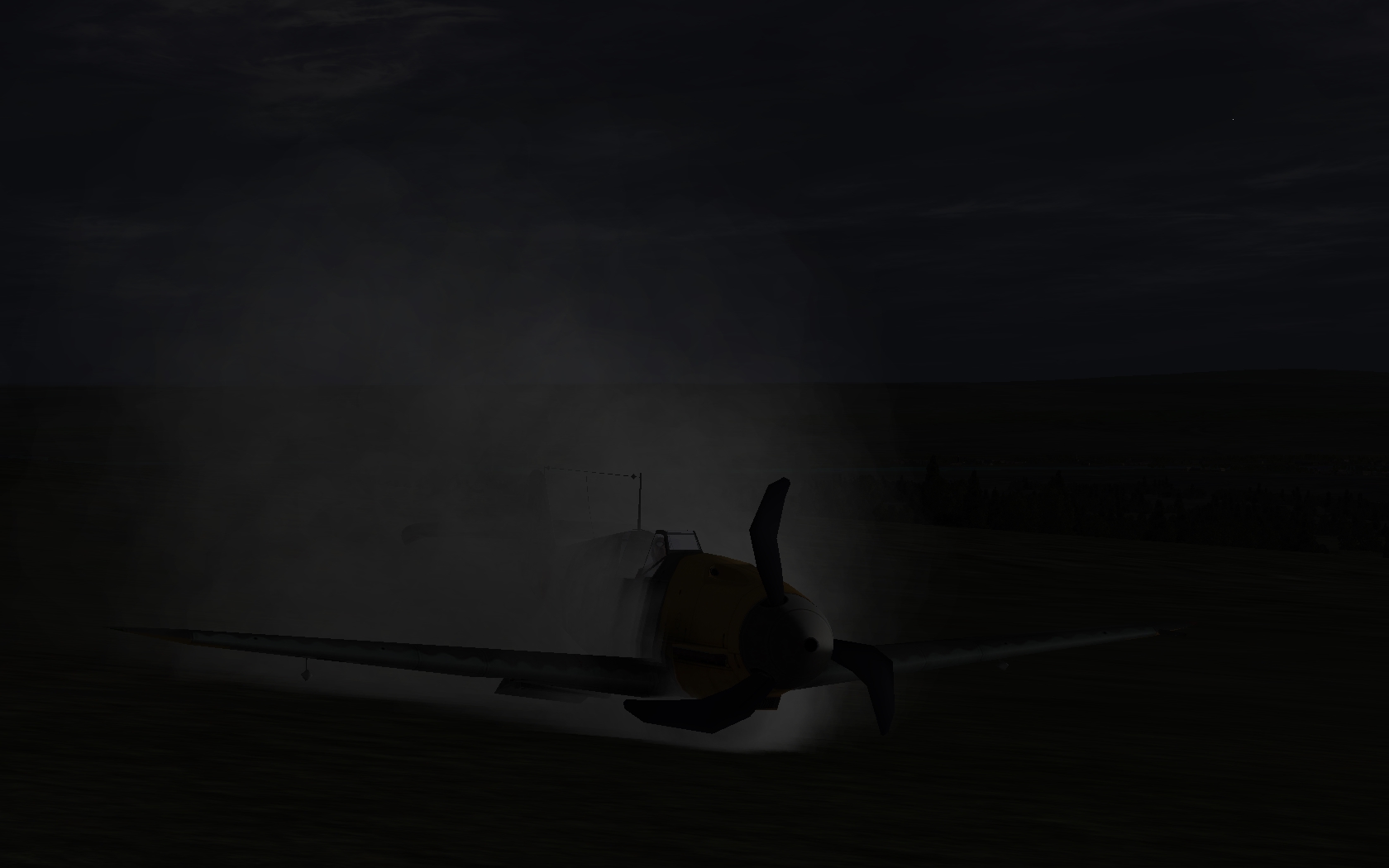 Сначала боялся что не найду цель в темноте, но таки нашел - точное выдерживание курса помогло Засадил ФАБ-250 прямо в ослепивший меня прожектор, после этого еле оторвался из остальных лучей, только переход на режим огибания местности помог. Огонь был сильный, но не точный. Тут прилетели немного отставшие СБ, прожектора и зенитки переключились на них. Я решил помочь товарищам на СБ, и штурмонул прожектора с пулеметов, смог 4 штуки загасить. Я уже направился домой, но тут на отходе стрелки прозевали мессера, который в двух атаках пробил мне баки, самолет стало сильно вести в сторону, и самое плохое, получил ранение, экран сильно покраснел. А ночью это, мягко говоря, неприятно. И так ведь видимость плохая. Я уже думал все, сейчас экран начнет темнеть, и придется или срочно прыгать, или на посадку идти где попало. Но дальнейшего помутнения вроде не наблюдалсь, и на сильно поврежденном ДБ я таки дотянул домой. Движки к счастью были не повреждены, но почему-то очень сильно вело в сторону, так и не понял почему. Повезло дотянуть до родного аэродрома и приземлиться, а это, я считаю, главное в каждой миссии!