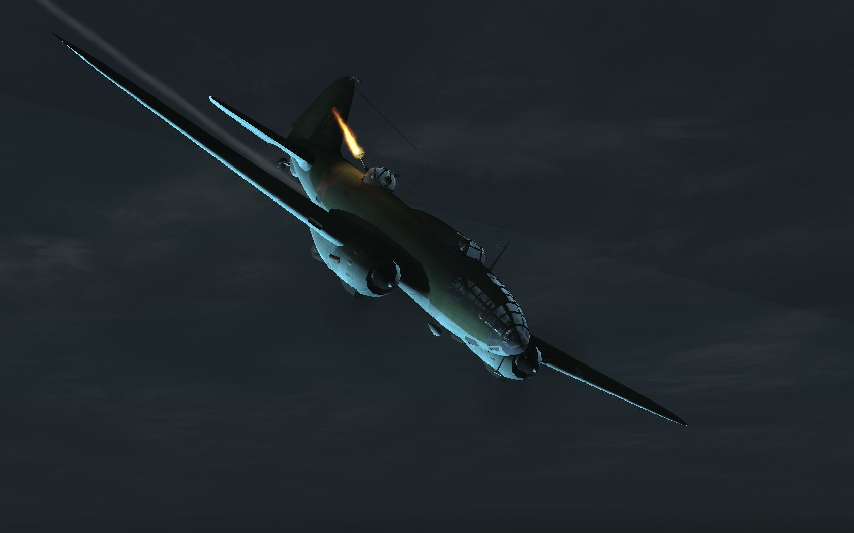 Сначала боялся что не найду цель в темноте, но таки нашел - точное выдерживание курса помогло Засадил ФАБ-250 прямо в ослепивший меня прожектор, после этого еле оторвался из остальных лучей, только переход на режим огибания местности помог. Огонь был сильный, но не точный. Тут прилетели немного отставшие СБ, прожектора и зенитки переключились на них. Я решил помочь товарищам на СБ, и штурмонул прожектора с пулеметов, смог 4 штуки загасить. Я уже направился домой, но тут на отходе стрелки прозевали мессера, который в двух атаках пробил мне баки, самолет стало сильно вести в сторону, и самое плохое, получил ранение, экран сильно покраснел. А ночью это, мягко говоря, неприятно. И так ведь видимость плохая. Я уже думал все, сейчас экран начнет темнеть, и придется или срочно прыгать, или на посадку идти где попало. Но дальнейшего помутнения вроде не наблюдалсь, и на сильно поврежденном ДБ я таки дотянул домой. Движки к счастью были не повреждены, но почему-то очень сильно вело в сторону, так и не понял почему. Повезло дотянуть до родного аэродрома и приземлиться, а это, я считаю, главное в каждой миссии!