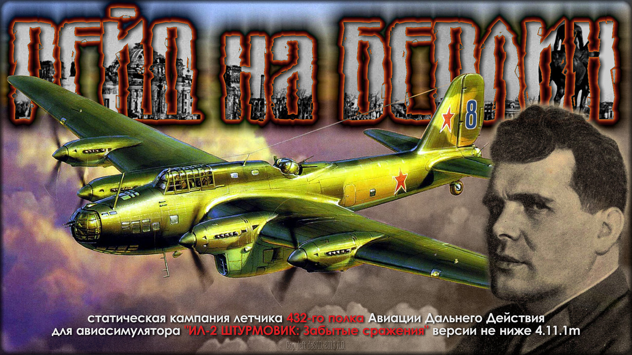 Коллеги, представляю великолепную безмодную статическую кампанию автора Виталия Варфоламеева (Командор), а так же ряда других товарищей, в том числе и наших коллег по сайту (список всех соавторов – в описании кампании) – «РЕЙД НА БЕРЛИН». Кампания небольшая (всего 6 миссий), но очень интересная. Она посвящена памяти летчикам 432-го бомбардировочного авиаполка авиации дальнего действия (АДД). 432-ой БАП АДД входил в состав 81-ой Бомбардировочной авиадивизии АДД, командиром которой был один из лучших советских летчиков довоенного периода – комбриг Михаил Васильевич Водопьянов. 432-ой БАП АДД летал на самых современных советских тяжелых 4-х моторных бомбардировщиках ТБ-7 (ПЕ-8). В ночь с 10 на 11 августа 1941 года полк, в составе своей дивизии (вместе с 420-ым БАП АДД), совершил налет и нанес бомбовый удар по столице III Рейха городу Берлину – как это происходило и рассказано в этой замечательной кампании. Часть материалов этой кампании я представил здесь (сама кампания и ее видеоролики, и другие материалы), другая часть кампании (скины самолетов-участников, материалы по радионавигации и другое) я выставляю на файлообменнике – ссылка http://www.fayloobmennik.net/6823223 пароль REID Кампания создавалась для версии авиасима V 4.11.1.m, но хорошо идет и в версии V 4.13.2.m.