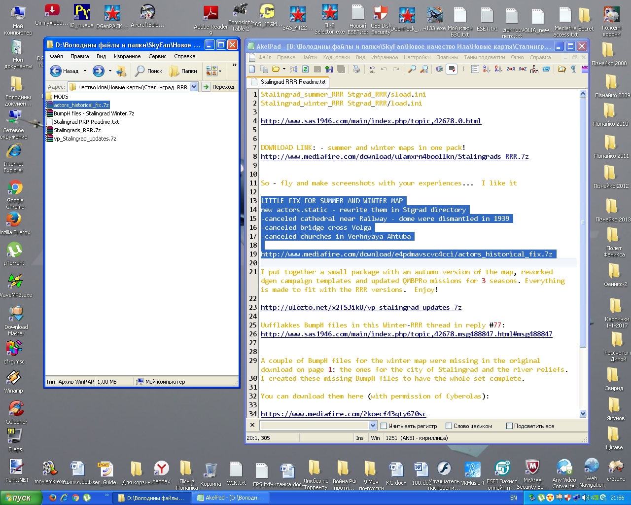 ![]() Шаг 00: заходим на SAS'овскую ветку с картой http://www.sas1946.com/main/index.ph...c,42678.0.html и качаем по доступным там ссылкам нужные нам архивы: - саму зимнюю и летнюю карту в одном флаконе http://www.mediafire.com/download/ul...ingrads_RRR.7z - фикс к ней http://www.mediafire.com/download/e4...torical_fix.7z - осеннюю карту http://ulozto.net/x2fS3ikU/vp-stalingrad-updates-7z Сохраняем все это в любую неигровую папку. У меня (к примеру) это D:\Володины файлы и папки\SkyFan\Новое качество Ила\Новые карты\Сталинград_RRR\ - у Вас может быть любая иная. Шаг 01. Первым распаковываем выделенный на одноименном скриншоте архив с картой, скачанный с так же выделенной ссылки. На выходе получаем папку MODS c подпапками mapmods/maps/_Tex + Stgrad. Вот с этими двумя папками _Tex + Stgrad нам и предстоит проводить основные манипуляции. Но мы их покуда не трогаем. Шаг 02. Распаковываем выделенный на одноименном скриншоте архив с фиксом для карты, скачанный с так же выделенной ссылки. На выходе получаем два файла: sactors.static и wactors.static, которые также покуда не трогаем. Шаг 03. Распаковываем выделенный на одноименном скриншоте архив с осенней картой, скачанный с так же выделенной ссылки. На выходе получаем папки #SAS, Dgen, Missions, PaintSchemes. Аналогично покуда не трогаем их. Шаг 04. На рабочем столе создаем "донорскую" папку под рабочим названием, например, "В папку MAPS". Название может быть любым - не принципиально. Главное - назначение этой папки: она играет роль котла, в котором будут смешиваться разные ингредиенты нашего колдовского зелья - до готовности. В первую очередь переносим в этот "котел" папки _Tex + Stgrad, полученные в результате шага 01. Шаг 05. Открываем папку ...Рабочий стол/В папку MAPS/Stgrad и переносим в нее файлы sactors.static и wactors.static, полученные в результате шага 02. На замену соглашаемся. Шаг 06. Открываем полученную в результате шага 03 папку #SAS и все прочие лежащие а ней папки, пока не доберемся до двух папок: _Tex + Stgrad. Не открывая, переносим обе эти папки по адресу: ...Рабочий стол/В папку MAPS/ и соглашаемся с заменой. ВАЖНО: теперь, если мы обе эти папки перенесем в игру по адресу: ...IL-2 Sturmovik Forgotten Battles\#DGEN\MAPMODS\MAPS c согласием на замену, то вместо двух дефолтных карт Сталинграда в нашей сборке будут доступны три более красивые карты от Cyberolas'a. Но все треки, ролики и ряд миссий, созданных ранее на дефолтных картах Сталинграда перестанут воспроизводиться. Если мы принципиально хотим забыть дефолтные карты Сталинграда, как кошмарный сон, придется смириться с потерей ряда треков, роликов и миссий. Но если мы предпочитаем поступить по принципу "и волки сыты, и овцы целы", понадобятся следующие шаги. Шаг 07. Переименовываем папку ...Рабочий стол/В папку MAPS/Stgrad в ...Рабочий стол/В папку MAPS/Stgrad_RRR. Теперь ухода дефолтных карт "в подполье" можно не опасаться. Шаг 08. Переносим папки _Tex и Stgrad_RRR из папки ...Рабочий стол/В папку MAPS/ по адресу: ...IL-2 Sturmovik Forgotten Battles\#DGEN\MAPMODS\MAPS c согласием на замену. Шаг 09. В файл all.ini, лежащий по адресу ...IL-2 Sturmovik Forgotten Battles\#DGEN\MAPMODS\MAPS вписать (можно скопировать/вставить) строки: Stalingrad_winter_RRR Stgrad_RRR/load.ini Stalingrad_summer_RRR Stgrad_RRR/sload.ini Stalingrad_autumn_RRR Stgrad_RRR/aload.ini В файл maps_ru.properties, лежащий по адресу ...IL-2 Sturmovik Forgotten Battles\#DGEN\STD\i18n вписать (можно скопировать/вставить) строки: Stalingrad_winter_RRR \u0421\u0442\u0430\u043B\u0438\u043D\u0433\u0440\u 0430\u0434_RRR (\u0417\u0438\u043C\u0430) Stalingrad_summer_RRR \u0421\u0442\u0430\u043B\u0438\u043D\u0433\u0440\u 0430\u0434_RRR (\u041B\u0435\u0442\u043E) Stalingrad_autumn_RRR \u0421\u0442\u0430\u043B\u0438\u043D\u0433\u0440\u 0430\u0434_RRR (\u041E\u0441\u0435\u043D\u044C) Шаг 10. Запускать "Ил" с пятью картами вместо двух и наслаждатьс