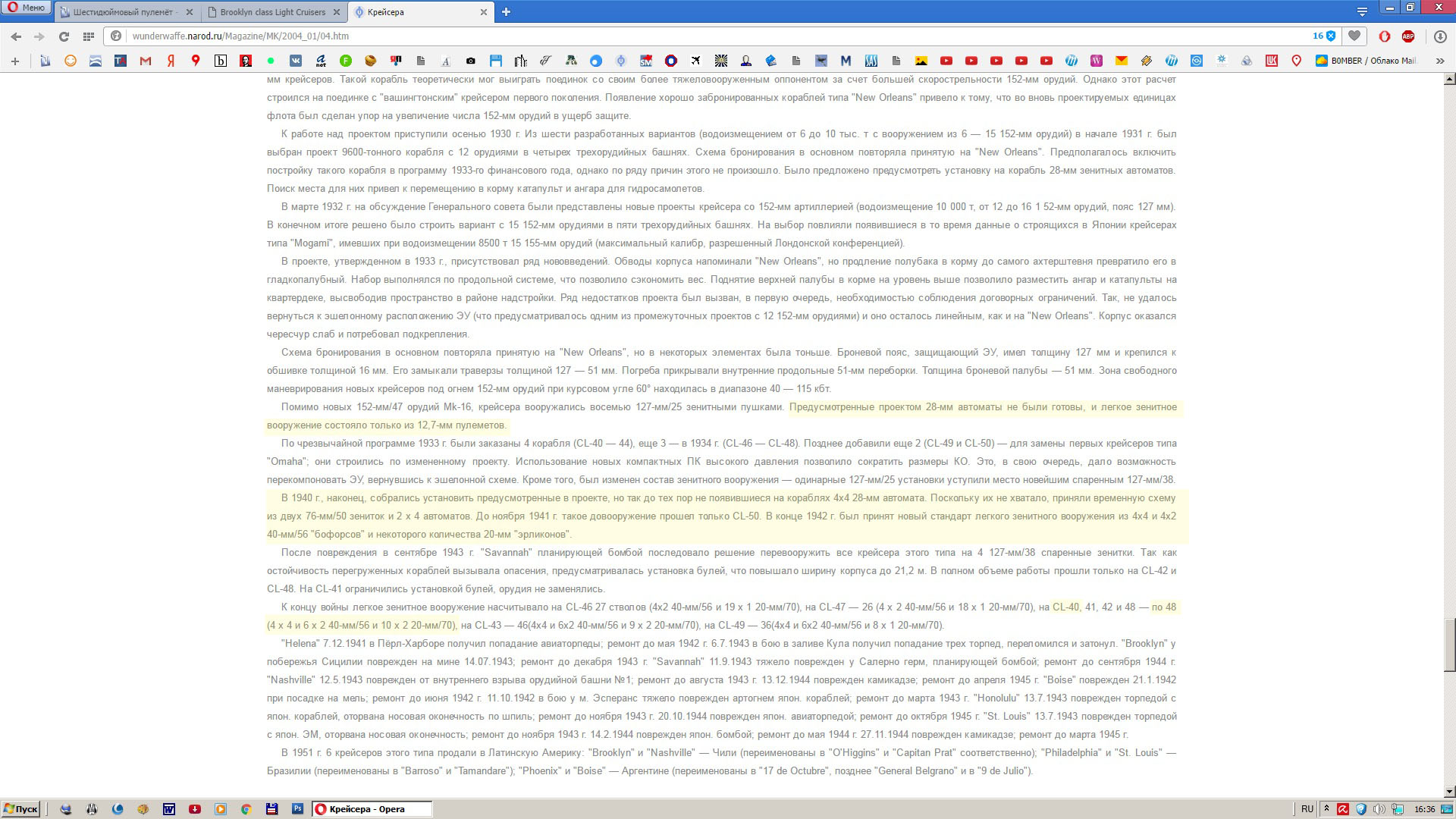 ![]() Просто стало интересно. И, судя по прочитанному, там тот ещё бардачок творился. ![]() Хотели одно, а в итоге ставили то, что есть в наличии. И постоянно перетряхивали ПВО. ![]() И вообще. Чем дальше в эти ваши интернеты залазишь, тем больше непоняток. ![]() Сначала крейсера получили открытые мостики поверх существующих надстроек, но с 1942 началась модернизация кораблей. Высота мостиков снижалась, а боевые рубки вообще снимались. Зенитное вооружение усилили, добавив 4x4- 28-мм автомата. Так как этих установок не хватало, появилась временная комбинация из 2 -76/50 орудий и 2 х 4 - 28-мм автоматов. Но к ноябрю 1941 такое вооружение получил только крейсер «Хелена». Однако во время ремонта повреждений, полученных в Пирл-Харборе, зенитки сняли и с него, чтобы передать на «Феникс» и «Гонолулу». Штатные места 28-мм автоматов располагались так: напротив фок-мачты и над первой возвышенной 127-мм установкой. Но на CL-49 и CL-50 они устанавливались на главной палубе напротив переднего и заднего концов надстройки. 76-мм зенитки простояли на крейсерах довольно долго. «Саванна» имел их до августа 1942, а «Феникс» - даже до февраля 1943. Первым шагом по усилению зенитного вооружения стала установка радара и 20-мм автоматов. В конце 1942 было решено установить по4х4и4х2 — 40-мм автоматов. Впрочем, зенитное вооружение различных кораблей различалось довольно сильно. К концу войны CL-46 и CL-47 имели 28 - 40 мм (4 х 4 + 6 х 2) и 20 - 20 мм (10 х 2), хотя CL-43 имел только 2 спаренных Эрликонов. Остальные крейсера несли одиночные 20-мм автоматы: 19 - «Феникс», 18 - «Бойз», 8 - «Сен-Луи». «Феникс» и «Бойз» имели по 4 х 2 — 40 мм. «Саванна» после повреждения 11 сентября 1943 у Салерно управляемой бомбой «Фриц-Х» прошел капитальную модернизацию. Он получил були, которые увеличили ширину корпуса до 21,2 м. Одиночные 127/25 мм орудия были заменены 127/38 спаренными. Були получили также «Бруклин», «Филадельфия» и «Гонолулу», но их не перевооружали. http://wunderwaffe.narod.ru/WeaponBook/USA_WW2/07.htm