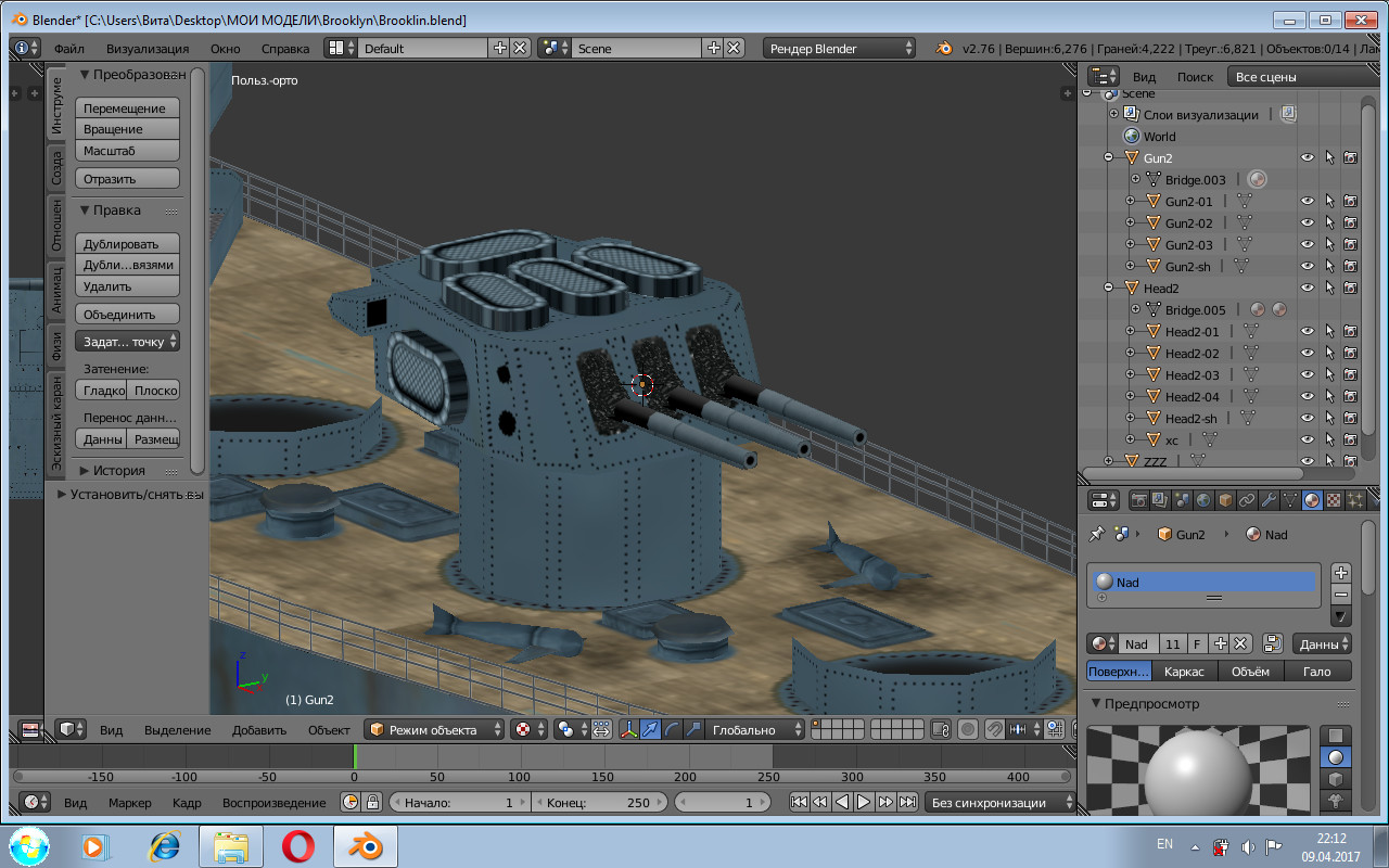 Не много разобравшись с работой уделил время любимому хобби. Заново перетекстурил модель, добавил всякую мелочь, люки, шпили, лебёдку. Обозначил барбеты ГК. Кажется мелочи, а времени требует много. И все равно есть ошибки. Очень мало информации. Казалось бы головной корабль, а чертежей именно Бруклина так и не было найдено. Фотографий тоже мало и большая часть не соответствует 43 году... Тем не менее работа продолжается. Всем мира...