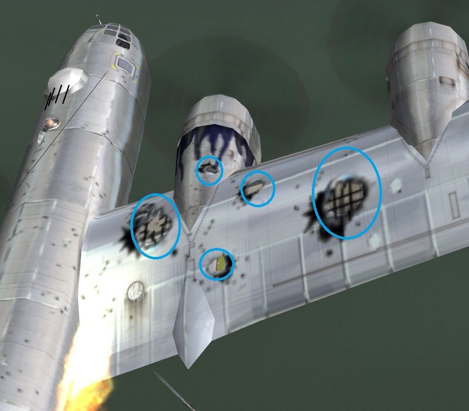 Модель повреждений готова, но есть одна проблема. Отверстия, которые должны появляться на фюзеляже и плоскостях, отрисовываются поверх текстур скина, т.е. скин просвечивает там, где должна быть дырка. На вложении показал. Есть способ исправить, чтобы было, как следует (в качестве примера показал на B-29)? В остальном дырки вроде бы получше стали, места под ОЗ и БН освободил (по крайней мере, постарался максимально отодвинуть).