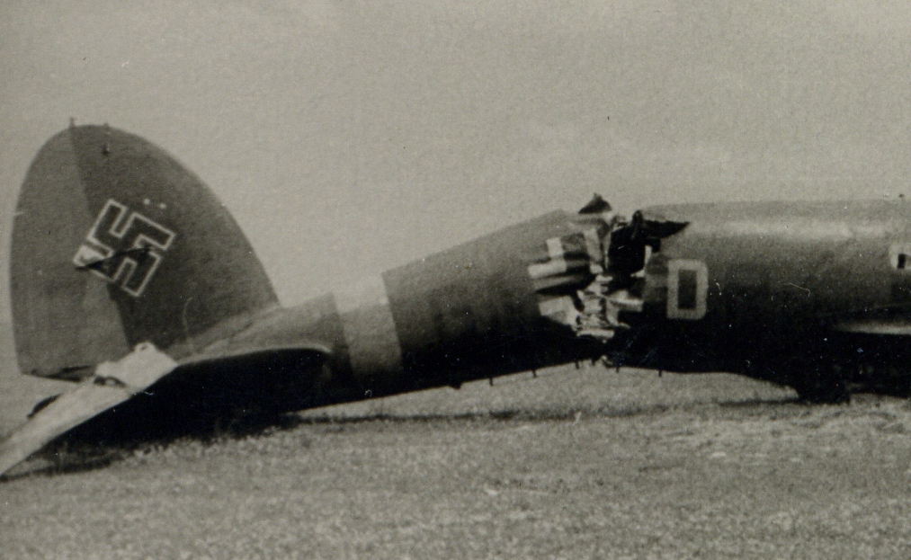 ![]() ![]() Сбитый «Хейнкель» He.111 из состава 7-й эскадрильи бомбардировочной эскадры KG 55 «Greif» (художник И. Злобин) |