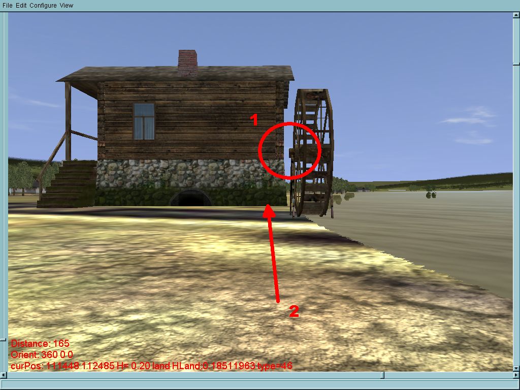 На первой - кружком обведена недостающая ось, стрелкой высота. На картинке 2 и 3 - вся мельница снижена на один метр - колесо находится в воде, как и положено.
