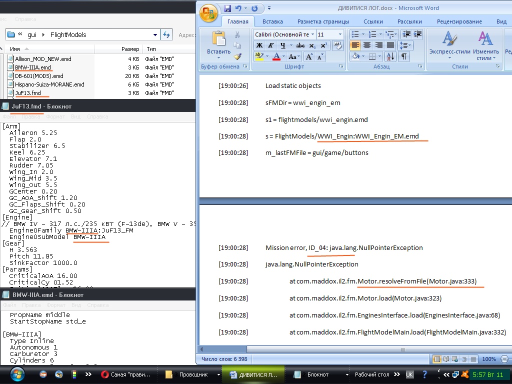 [19:00:28] Mission error, ID_04: java.lang.NullPointerException [19:00:28] java.lang.NullPointerException [19:00:28] at com.maddox.il2.fm.Motor.resolveFromFile(Motor.java:333) [19:00:28] at com.maddox.il2.fm.Motor.load(Motor.java:323) [19:00:28] at com.maddox.il2.fm.EnginesInterface.load(EnginesInterface.java:68) [19:00:28] at com.maddox.il2.fm.FlightModelMain.load(FlightModelMain.java:332) [19:00:28] at com.maddox.il2.fm.FlightModelMain.<init>(FlightModelMain.java:613) [19:00:28] at com.maddox.il2.fm.FlightModel.<init>(FlightModel.java:66) [19:00:28] at com.maddox.il2.fm.AIFlightModel.<init>(AIFlightModel.java:29) [19:00:28] at com.maddox.il2.ai.air.Maneuver.<init>(Maneuver.java:639) [19:00:28] at com.maddox.il2.ai.air.Pilot.<init>(Pilot.java:99) [19:00:28] at com.maddox.il2.fm.RealFlightModel.<init>(RealFlightModel.java:110) [19:00:28] at com.maddox.il2.objects.air.Aircraft.setFM(Aircraft.java:1906) [19:00:28] at com.maddox.il2.objects.air.Aircraft.setFM(Aircraft.java:1896) [19:00:28] at com.maddox.il2.objects.air.Aircraft.load(Aircraft.java:2339) Вот посмотрите картинки как на минимальной сборке под 4.10.1 у меня поставлен мод Юнкерса. В него я положил новую фм, в которой есть ссылка на новый мотор и он есть в наличии. Картинки внизу тому подтверждение. ------------------------- Есть вариант попросить кого нибуть из родных помоложе помочь вам розархивировать новую фм и положить в папку с модом Юнкерса. ![]() Последний раз редактировалось Vasya; 11.07.2017 в 08:49. Причина: Дополенеие текста |