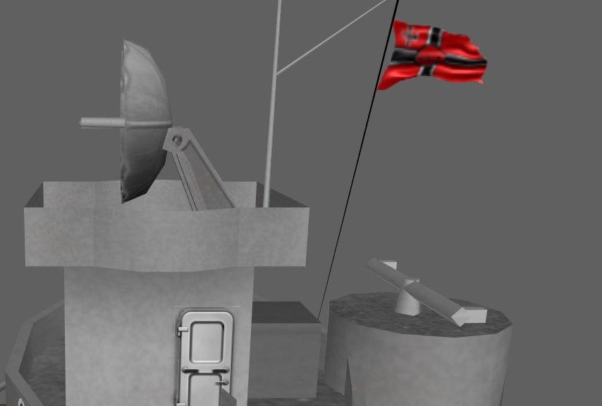 А леера только стойки и троса. Это закон для всех стреляющих кораблей. Команда "Рубить леера" знакома? Когда трос отдается а стойки укладываются на палубу шарнирно. Поэтому тросик не толще самолетной антенны желательно модовой он тоньше и аккуратнее. =================================== Полотнище флага сминается при помощи инструмента Liquify в фотошопке а потом при помощи инструментов затемнения и осветления (lights) рисуются складки ткани. Очертания флага выделив переносятся на альфа канал. Просто и со вкусом.