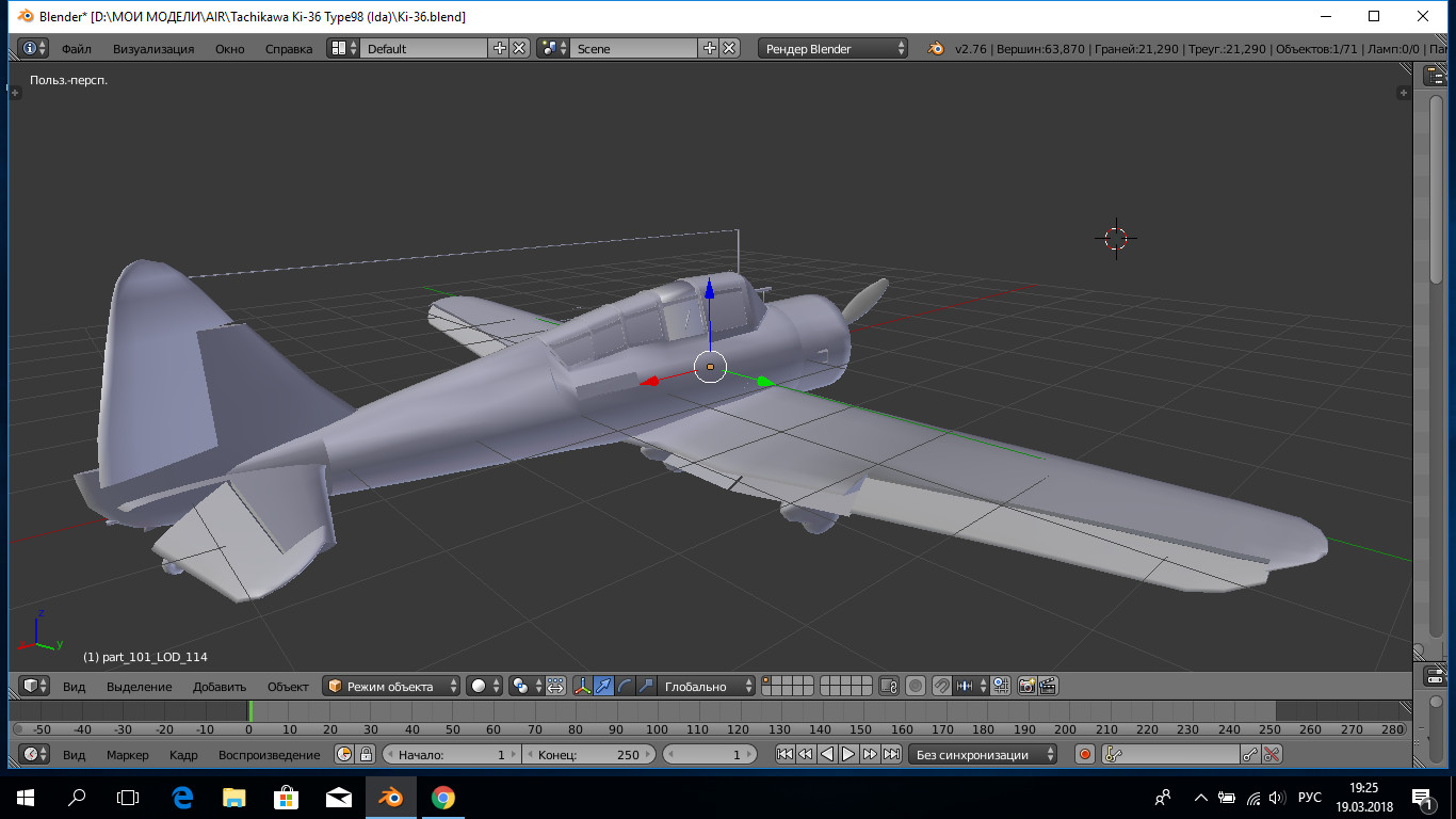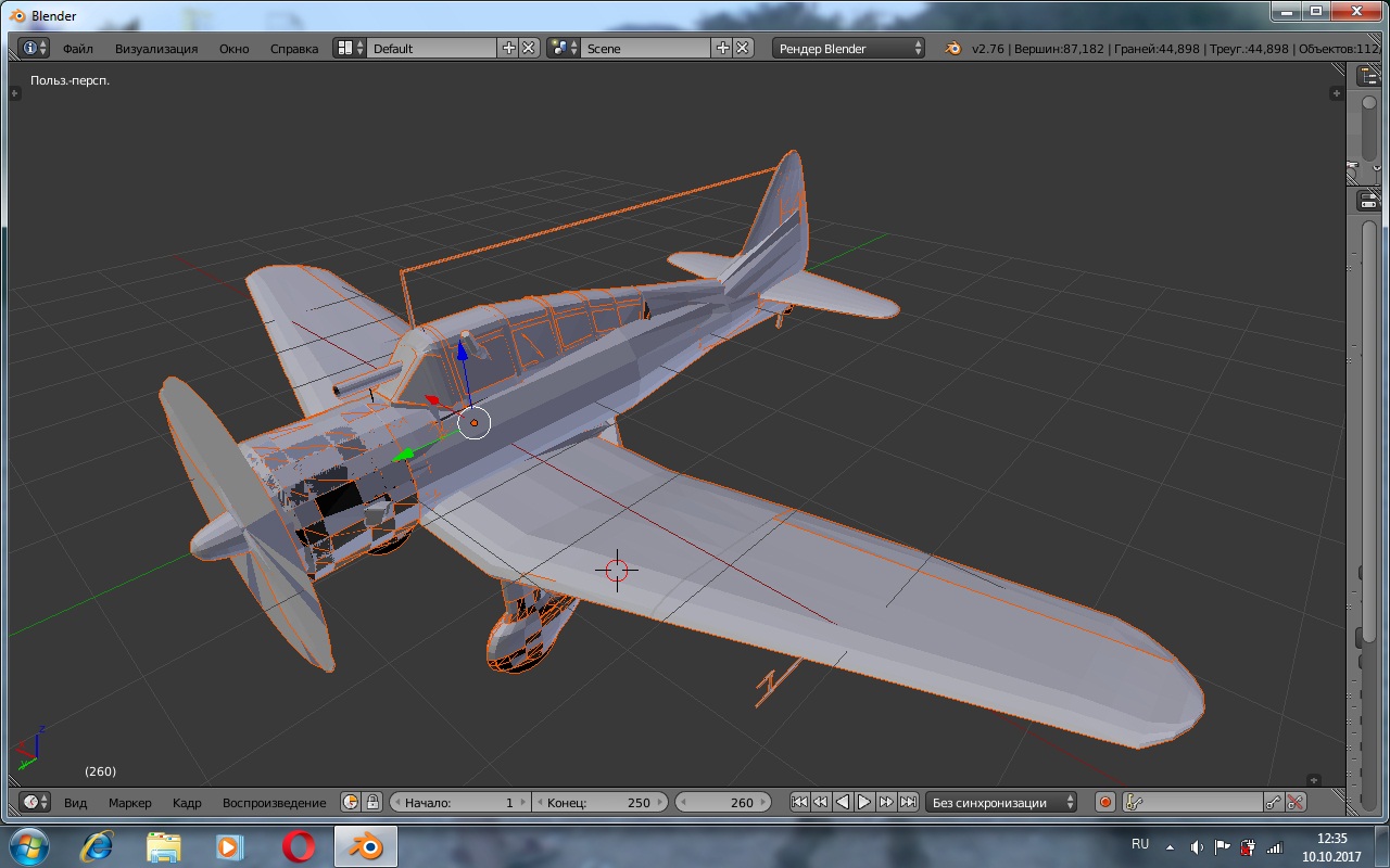 Модель открытая в Блендере весит 44898 треугольников. Она текстурирована, разделена на части и имеет простой кокпит. Есть и лоды, и еще какие то части мне пока не понятные. Надо разбираться...