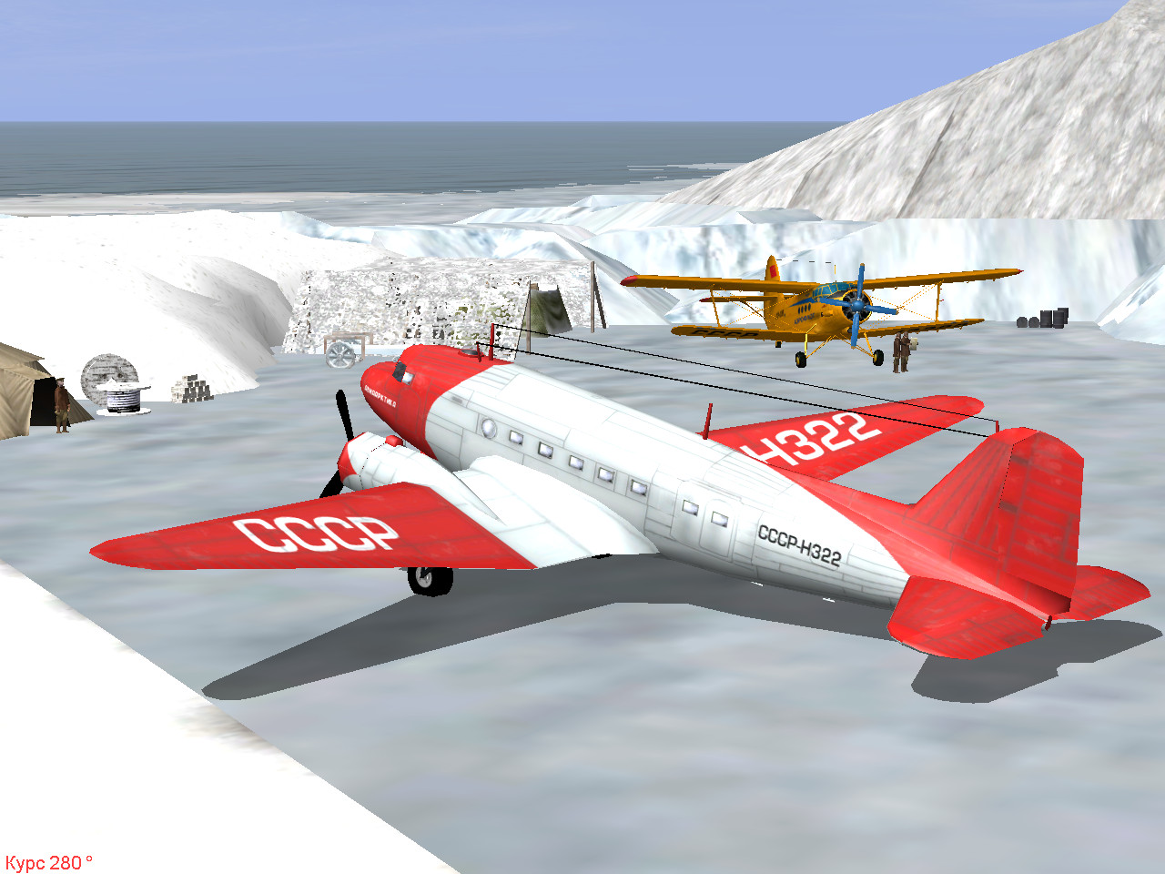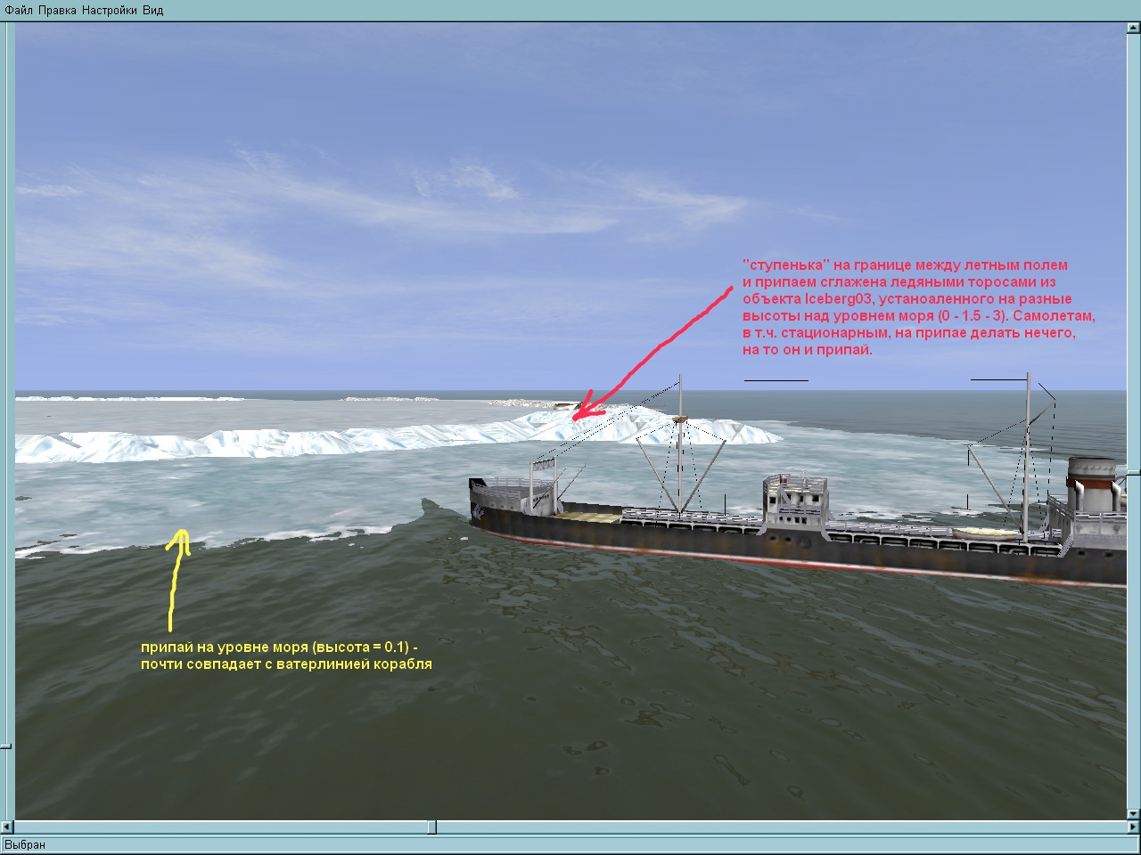В качестве компромиссного варианта предлагаю (но не настаиваю): 1) центральную льдину, на которую садится самолет, оставить на текущей высоте; 2) припаи опустить до уровня моря (0.1-02), чтобы они совпадали с ватерлинией кораблей; 3) образовавшиеся ступеньки сгладить ледяными торосами, с ролью коих ИМХО неплохо справляется объект Iceberg03 из пака от Boomer и из карты Антарктиды. Пример - на скриншоте "Припай на уровне моря". Понятно, что за пределами ледового поля (за торосами и на припае) самолету игрока делать нечего. Правда, при этом не решается проблема размещения стационарных самолетов, но если создатели этого гениального пака: http://forum.aviaskins.com/showthread.php?t=4930 пойдут навстречу, согласившись создать хотя бы DC-3/C-47/Ли-2 (в идеале на лыжах) для меню "Объекты", это было бы решением проблемы. Ведь если Ан-2 из этого пака можно использовать только с середины 50-х, то "Дакота" была бы универсальным солдатом для всех эпох - с середины 30-х до середины 60-х. Наверняка в MFSX что-то подобное есть. А потом при желании и доброй воле пак полярной авиации можно было бы расширять. Нерешенная проблема: взрыв самолета игрока при попытке взлететь со льдины. Но штатная тестовая ВПП№1 ведет себя аналогично, в отличие от авианосцев. Идей по решению пока нет.