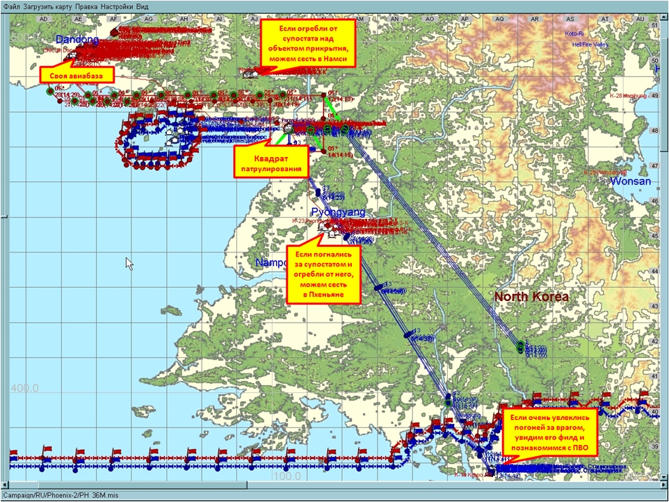 2) На использованной в кампании карте Корейского ТВД 3BG в районе устья реки Ялуцьзян отражен всего один из аэродромов (Аньдун/Лянтоу), с которых работали советские и китайские авиачасти. Остальные передовые аэродромы на карте отсутствуют. Авторы не стали их воссоздавать, чтобы не утяжелять и без того громоздкую карту и не создавать почву для фризов.