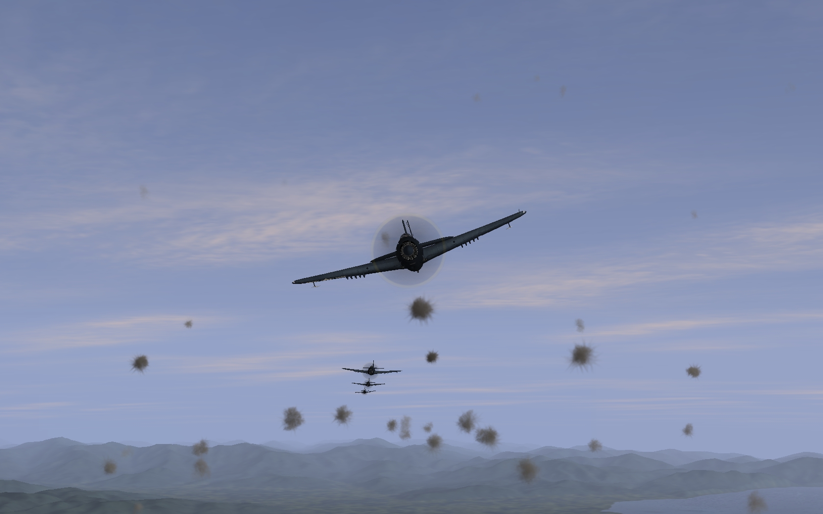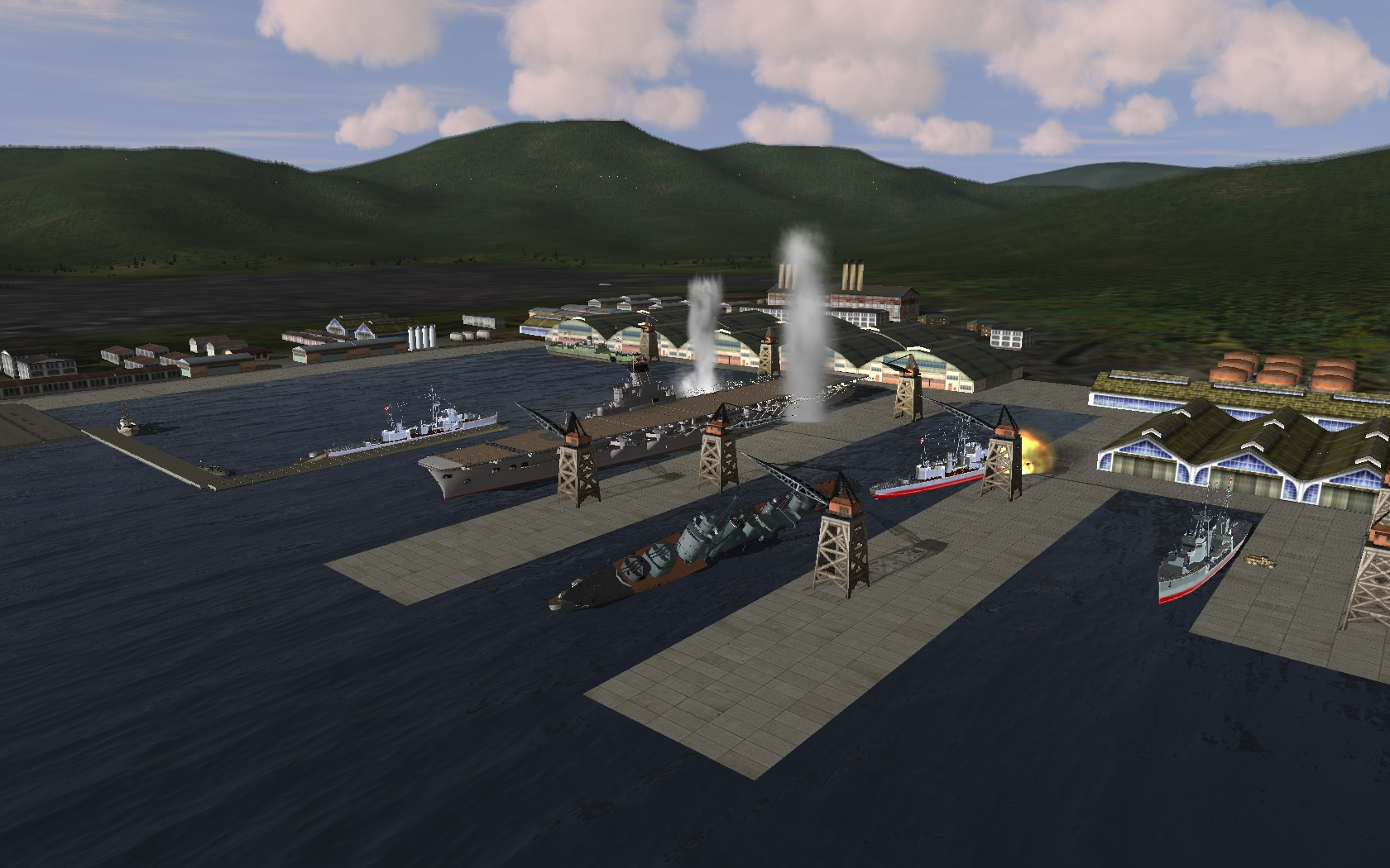 Пикировщики набегают на японский флот в Куре. Как обычно, у меня в порту будут не только лишь стационарные цели, несколько кораблей при подходе ударных самолетов начнут двигаться и маневрировать, пытаясь сбежать. Зенитный огонь очень сильный. Потери ботов, которые как известно о противозенитном маневре ничего не знают, будут такими же высокими, как в реале. Тут удачное совпадение, если говорить про реалистичность.