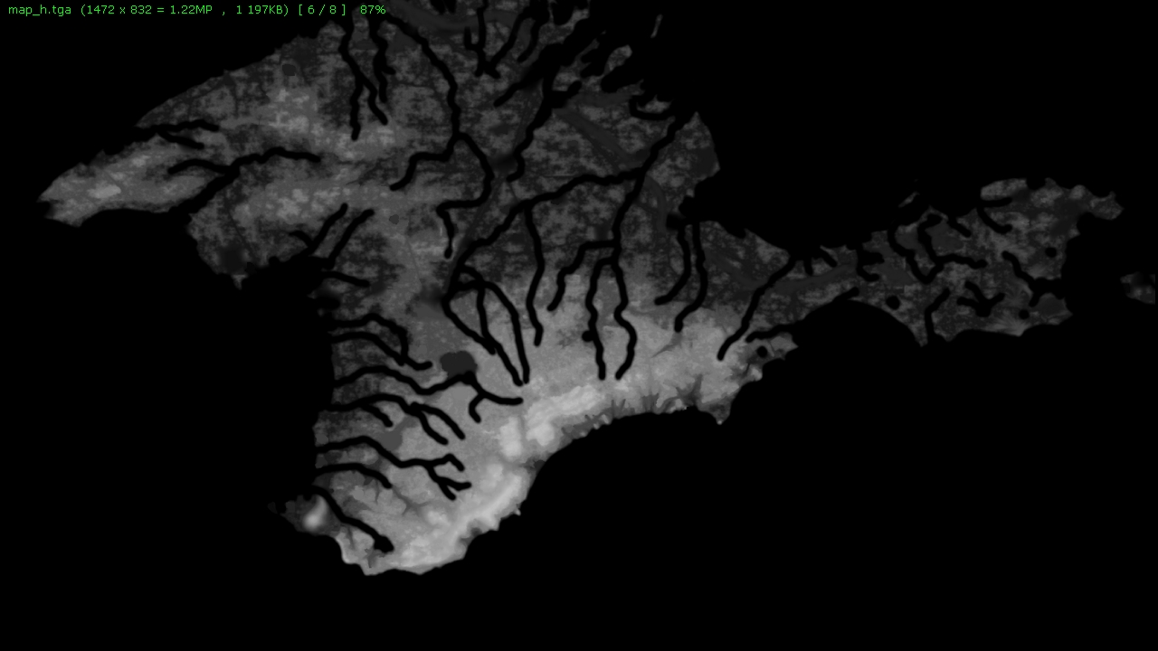 ЗЫ: таки глючит русифицированный ГИМП 2.8: при переводе мап_Т Крыма обратно в градации серого все ЭрДжиБи снова слетели..бэкап рулит. Если погода не помешает (вчера было +17 днем, сегодня -3 и поземка), скину завтра все, что сегодня успею, по карте Крыма. Работы по летней карте (Крым РРР) оказалось больше, чем рассчитывал сначала. ЗЫЫ: добивает постоянный непредсказуемый рост деревьев по берегам моря, даже бланкплэйтс не спасают, при новом открытии карты в игре они могут объявиться на новом месте..