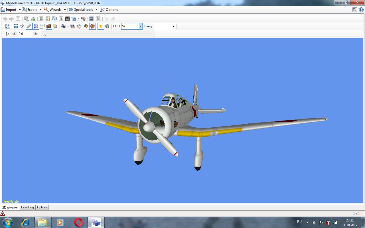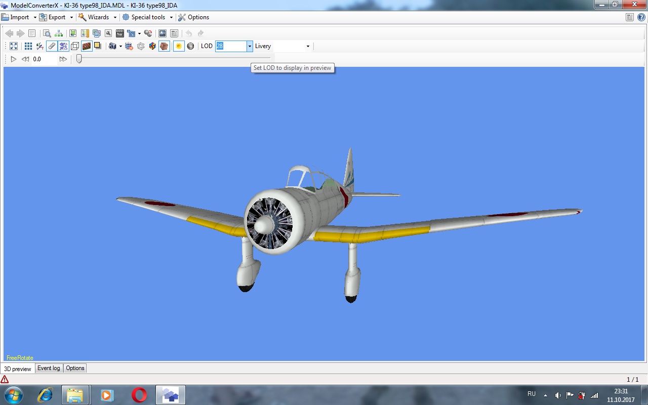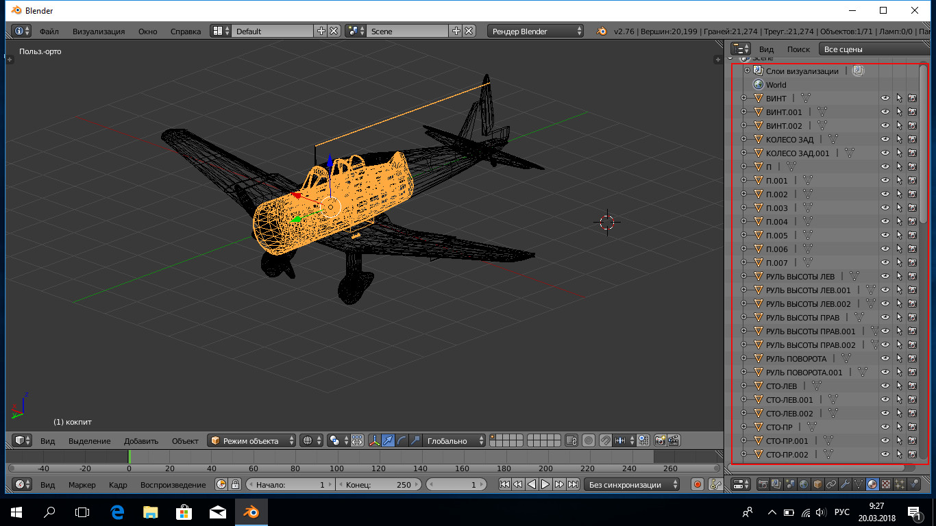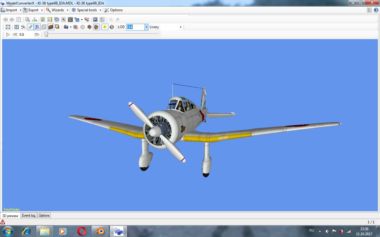 Модель открытая в Блендере весит 44898 треугольников. Она текстурирована, разделена на части и имеет простой кокпит. Есть и лоды, и еще какие то части мне пока не понятные. Надо разбираться...