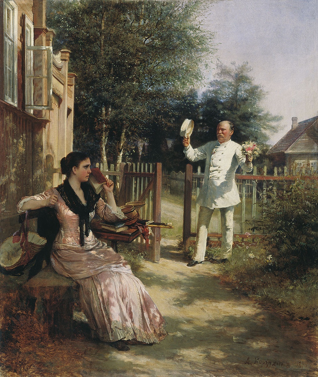 Картина А. Корзухина "Надоел" (1889). Скажу сразу: Действо разворачивается в каком то дачном посёлке. Персонажей мало - двое. Но, всё равно интересная повесть на холсте. Первое, за что хватается глаз - баришня. В самом деле. Молода, мила, не замужем наконец. Да, ещё рассержена. Да, и не просто рассержена - в гневе (судя по кулачку правой руки). В левой руке книжка которой она прикрывает свой гнев, не желая лишний раз выказывать его своему гостю. Гость, мало того что рад встрече, он ещё и с букетом. Стало быть - готовился. Но! Калиточку не прикрыл. Отсюда вывод: знает, что погонят, но надежды не теряет, и что то должен успеть. Тут я немного отступлю от повести, рассажу диспозицию. Если провести вертикальную линию строго по середине холста , то она пройдёт по калитке и тропинке. Напрочь разделяя этих двух персонажей. Т.е. калитка является началом сюжета и, скорее всего его завершением, весьма скорым. А, тропинка границей, которою не следует пересекать гостю. По этому, он старается перемещаться вдоль дорожки...во фронт к баришне. С тем, что бы она смогла рассмотреть его чиновничий костюмчик (судя по пуговицам) и орденскую ленточку в одной из петелек. Ну, и букетик. Его цель - блеснуть всем парадом. По достижению цели, он смело может валить с чувством полного удовлетворения. Эдакий Семён Семёнович Говядин. Но, вернёмся к баришне. Если присмотреться к её левой руке, то станет заметно, что за книжками, на которые ручка опирается лежит полный комплект для вечерней прогулки (зонтик, косынка, трость и несессер). Кроме того, и шляпка, которая висит в полной боеготовности в левом краю картины. Из этого делаю вывод, что есть ещё третье лицо. И с минуты на минуту оно должно продефилировать по этой улице, и как бы невзначай пригласить баришню на эту самую прогулку...Вернее, она на это надеется. И её раздражает не сам гость, а его присутствие, которое может смутить долгожданного прохожего. |