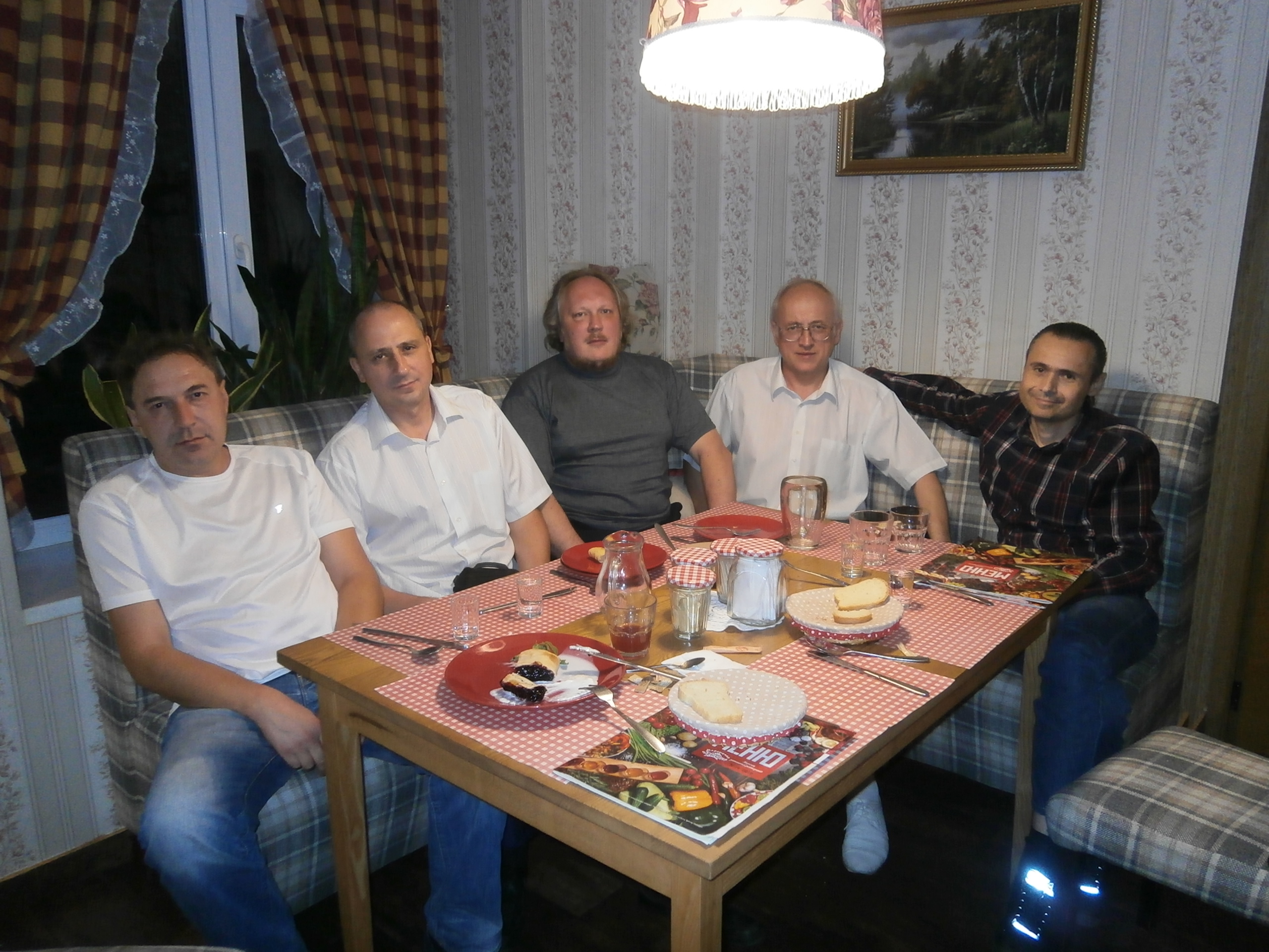 1. Встретились и посидели душевно ![]() 2. Были настолько увлечены общением, что о фото участников вспомнили только тогда, когда весь алкогольно-кулинарный натюрморт был уже уничтожен ![]() 3. Засиделись дотемна, поэтому первоначальный замысел о групповом фото у памятника Маэстро утратил смысл. 4. После выхода из заведения около часа (точно не засекал) продолжали общение под открытым небом. 5. Всем, кто хотел бы, но не смог присоединиться к нашей компании, предлагаем присоединиться (хотя бы автономно) к стартовому тосту: за то, чтобы виртуальное небо было горячим, а реальное - мирным. P.S. На фото слева направо: VALERA, Niro, Vasya, SkyFan, deSAD